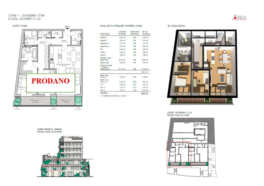 stan 1/suteren 2 (-2) = 99,70 m2 + terasa 16,47 m2 + 2 garažna parkirna mjesta PRODANO