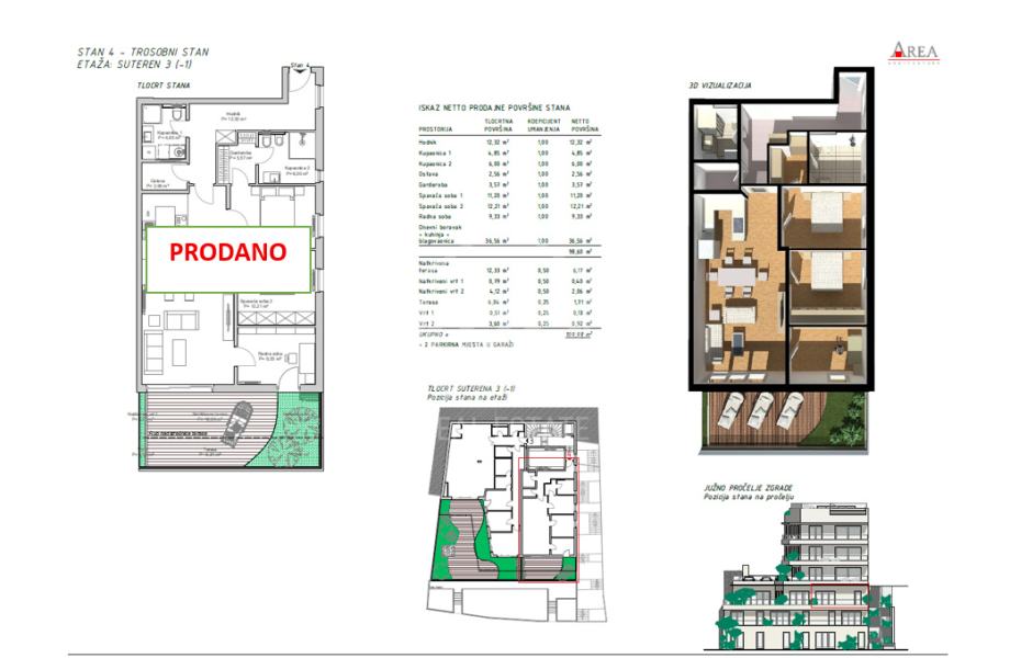 stan 4/suteren 3 (-1) = PRODANO, 98,62 m2 + terasa 28,68 m2 + 2 garažna parkirna mjesta