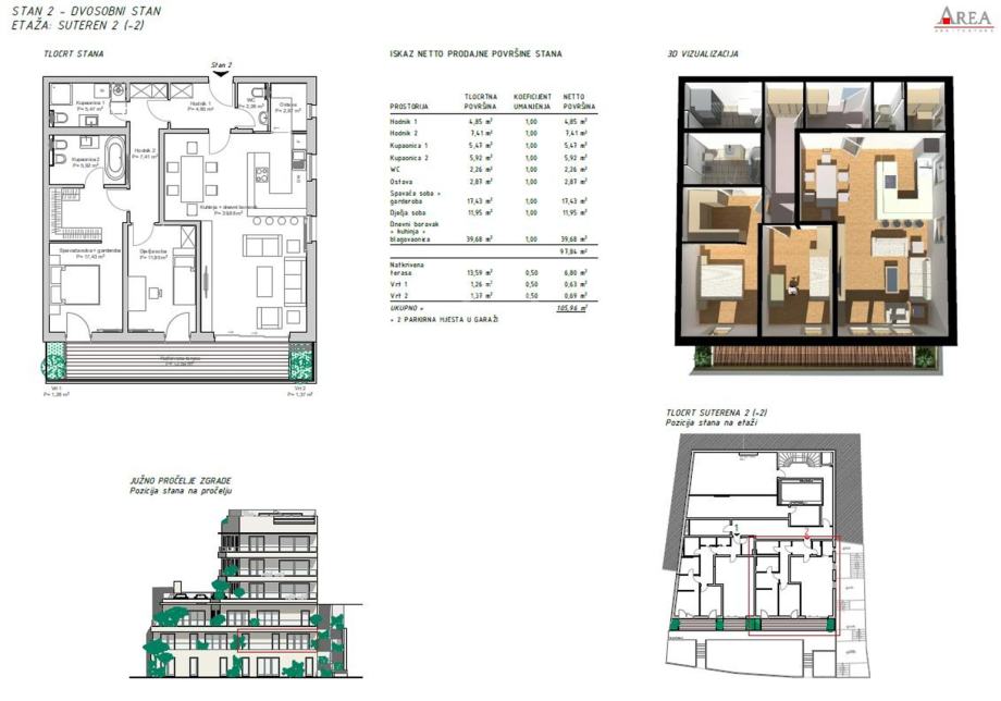 stan 2/suteren 2 (-2) = 97,83 m2 + terasa 16,48 m2 + 2 garažna parkirna mjesta