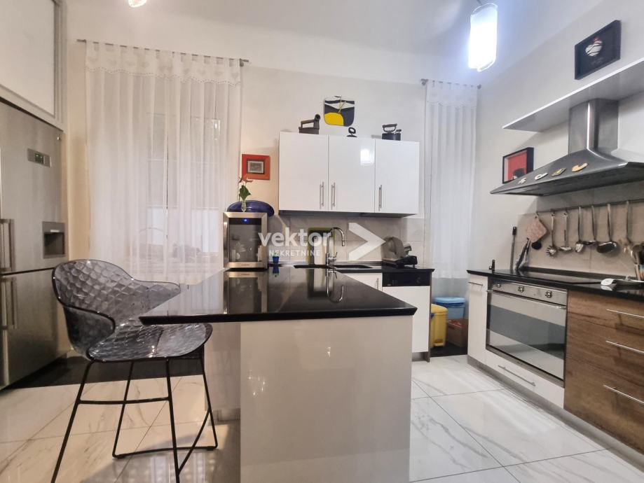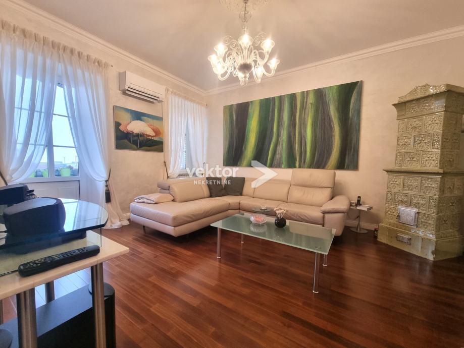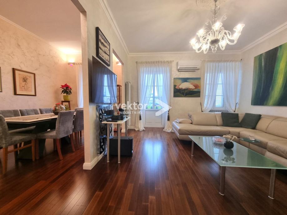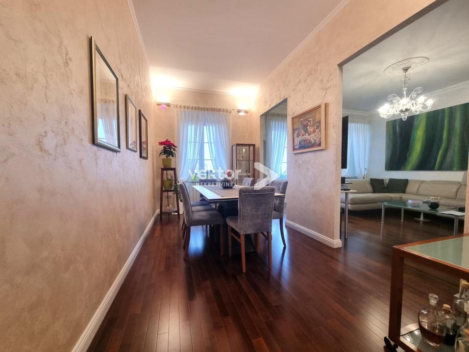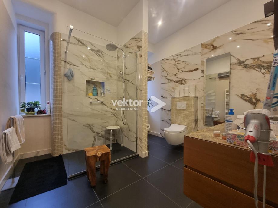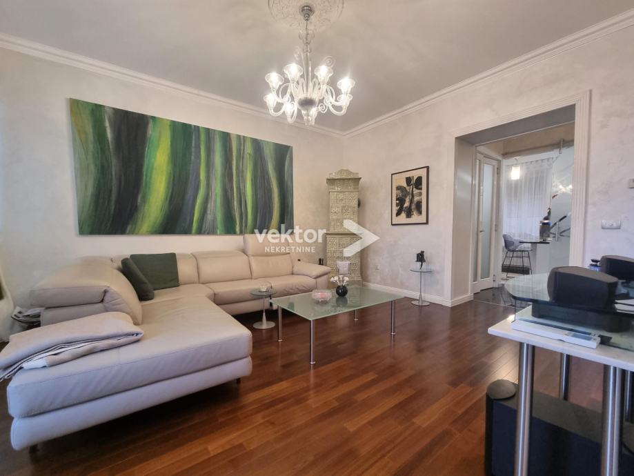 Stan površine 127m2 nudi odlično ukomponiranu kombinaciju stare gradnje i modernog koncepta stanovanja. Prilikom adaptacije promijenjene su sve instalacije struje i vode, nove kupaonice, kvalitetna keramika, podne obloge, svi materijali su pomno odabrani vodeći računa o kvaliteti i estetici.