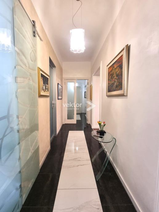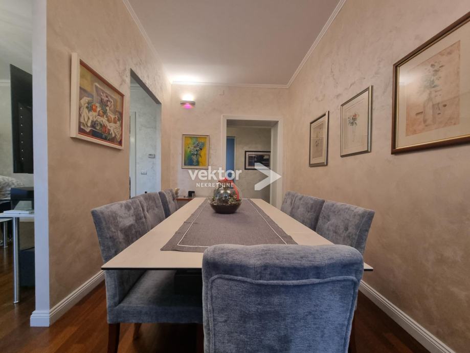 Sve prostorije u stanu su velike i funkcionalne, ima četiri sobe od kojih se ona najveća koristi kao dnevni boravak koji je povezan s blagovaonom. Moderna kuhinja rađena po mjeri i doista velika kupaonica zaokružuju cijelu priču. Balkon se proteže cijelom dužinom stana i pruža pogled na grad i more.