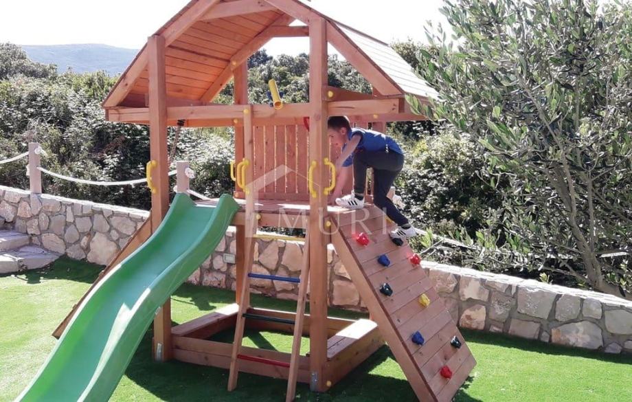 Nadalje, u potkrovlju se nalaze još dvije sobe. Sama okolica kuće nudi zabavu za sve uzraste. Za najmlađe na dječjem igralištu, a ostali mogu uživati u bazenu, jacuzziju i sauni. Kuća ima parking za 5 automobila.