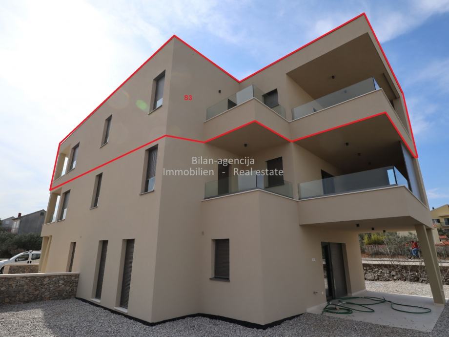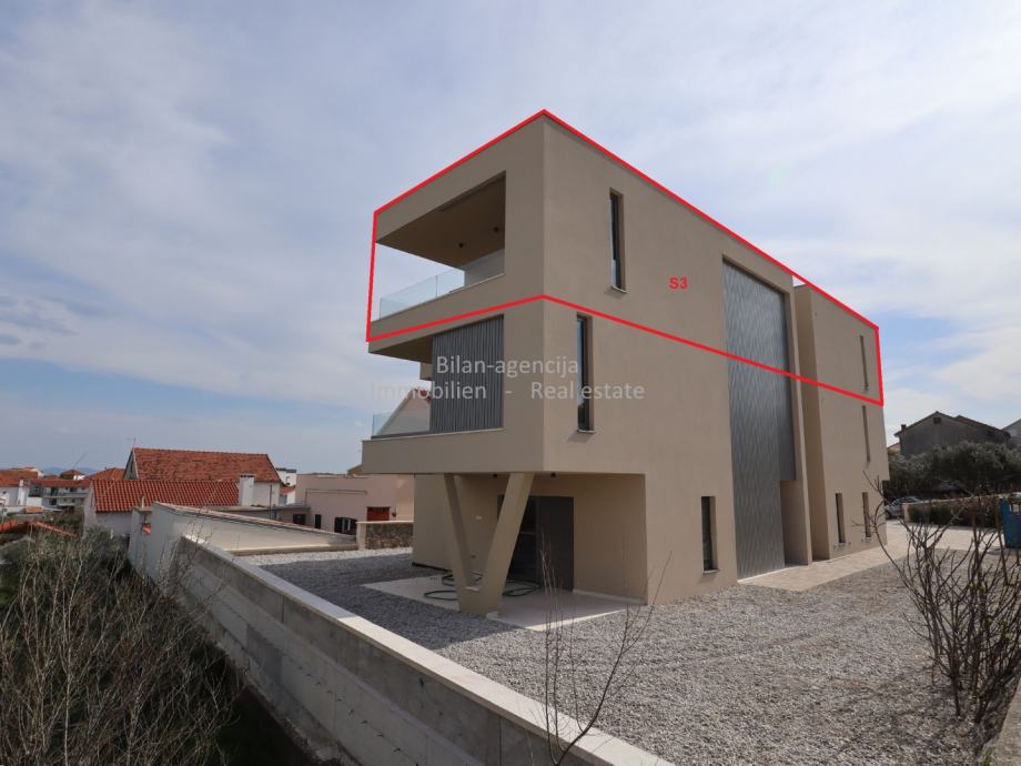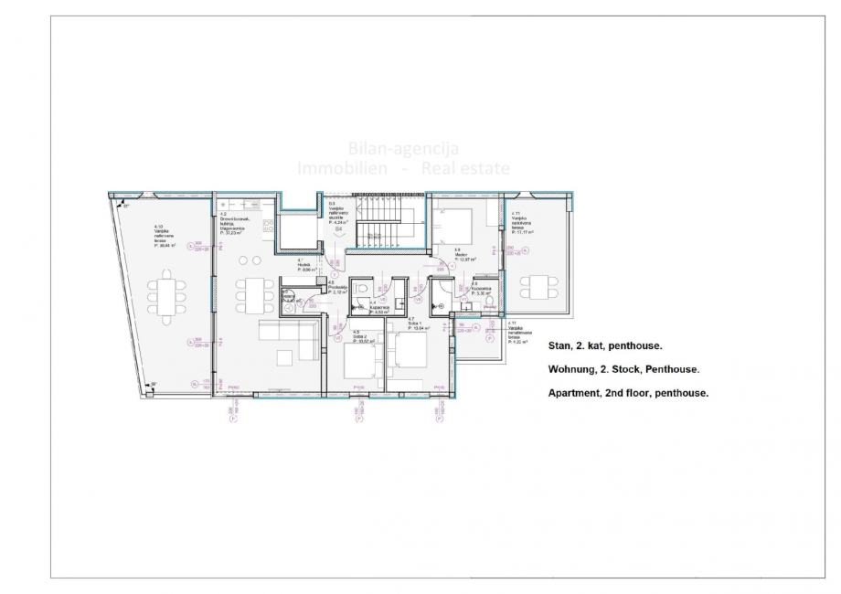 Nalazi se na drugom katu, odličnog rasporeda, sastoji se od ulaza, hodnika, 3 spavaće sobe, 2 kupaonice, vešeraja, dnevnog boravka, kuhinje i blagovaonice, 2 natkrivene terase i jedne nenatkrivene terase. Sa terasa se pruža lijepi pogled na grad i more.