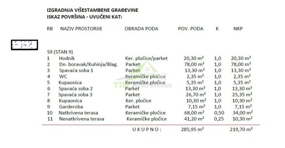 Prostran te funkcionalan četverosobni stan S9 smješten na drugom katu stambene zgrade ukupne obračunske površine 285.95 m2 i neto korisne površine 219.70 m2.