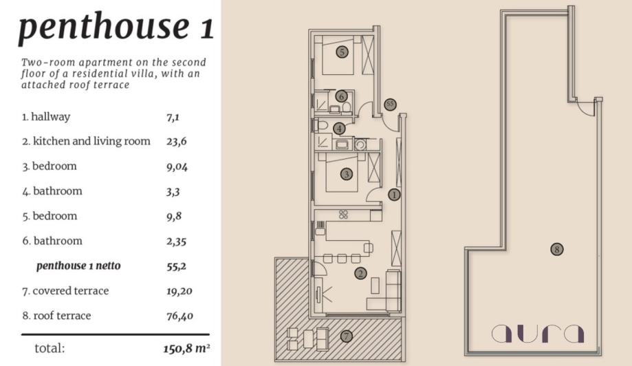 We mediate the sale of a beautiful comfortable Penthouse in a luxurious Villa 150m from an attractive beach. On the lower floor there are two bedrooms, two bathrooms with a toilet, a living room connected to the dining room and kitchen, a covered terrace, and on the upper floor there is a large roof terrace of 76m2 where the customer will be able to install the facilities of his choice (e.g. hydromassage pool, deck chairs, electric grill, etc.) (SEE FLOOR PLAN). The roof terrace has a hot and cold water connection from the apartment, and has an entrance door that can be locked and is used exclusively by the tenants of the apartment below it. There is the possibility of installing solar panels and panels for the preparation of hot water for own needs, which makes the building energy efficient, A class. It has TV, SAT, network sockets(internet) and several electrical outlets. electrical outlet. LED lights will be used as lighting, which can be dimmed to adapt to the intimacy of the stay and the type of use.