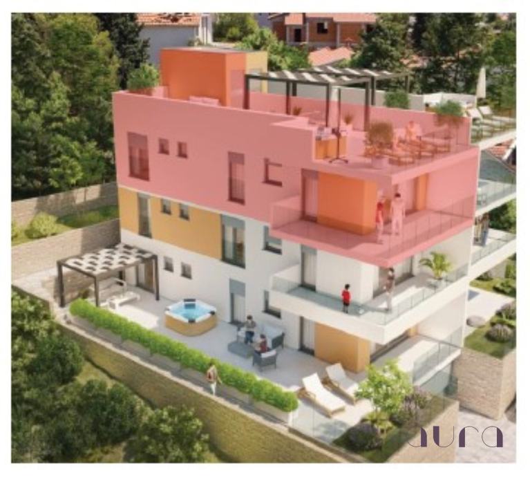 Posredujemo u prodaji prekrasnog komfornog Penthouse-a u luksuznoj Villi 150m od atraktivne plaže. Na donjem katu su dvije spavaće sobe, dva kupatila sa wc-om, dnevnog boravka spojenog sa blagovaonom i kuhinjom, natkrivene terase, a na gornjem katu je velika krovna terasa 76m2 gdje će kupac moći postaviti sadržaje po svom izboru (npr. hidromasažni bazen, ležaljke, električni roštilj i sl.)(VIDI TLOCRT). Krovna terasa ima priključak tople i hladne vode iz stana, te ima ulazna vrata koja se mogu zaključati i koristi se isključivo od strane stanara stana ispod njega. Postoji mogućnost ugradnje solarnih panela i panela za pripremu tople vode za vlastite potrebe, čime je zgrada energetski učinkovita, A klasa. Ima TV, SAT, mrežu utičnice(internet) i nekoliko el. utičnica. LED svjetla će biti koristi se kao rasvjeta, koja se može prigušiti prilagoditi se intimnosti boravka i vrstu upotrebe.