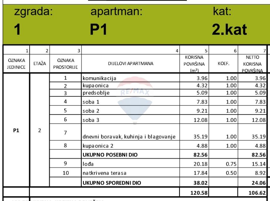 Apartman je ukupne neto korisne površine od 106.62 m2 te se sastoji od stubišta, predsoblja, tri spavaće sobe, dvije kupaonice, kuhinje, blagovaonice i dnevnog boravka te dva balkona (lođa od 20.18 m2 na koju se izlazi iz spavaće sobe te natkrivena terasa od 17.84 m2 na koju se pristupa iz prostora blagovaonice i dnevnog boravka). Pogled na more. Apartmanu pripadaju dva parkirna mjesta.
