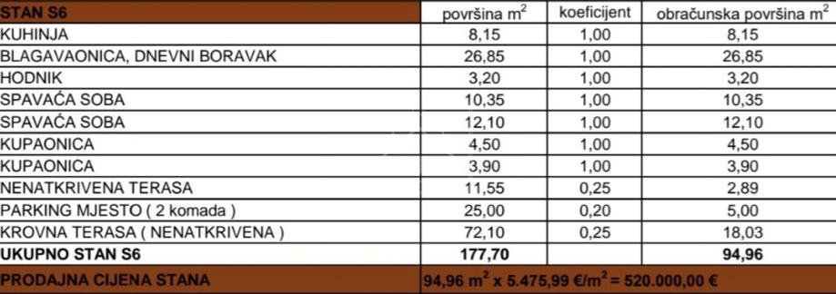 Stan S6 na 2. katu, s krovnom terasom, dvosoban sadrži: ulazni prostor s kuhinjom (pov. 8.15 m2), dnevni boravak s blagovaonicom (pov. 26.85 m2), hodnik (pov. 3.20 m2), dvije spavaće sobe (pov. 12.10 m2 i 10.35 m2), dvije kupaonice (pov. 4.50 m2 i 3.90 m2) i natkrivenu terasu (11.55 m2 x 0.50 =5.78 m2).