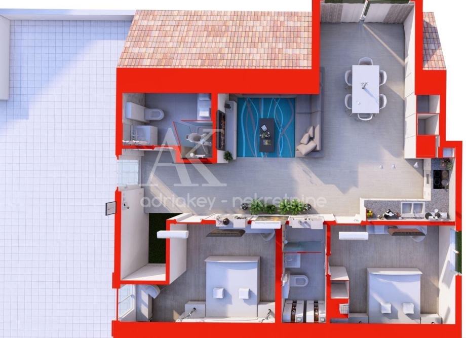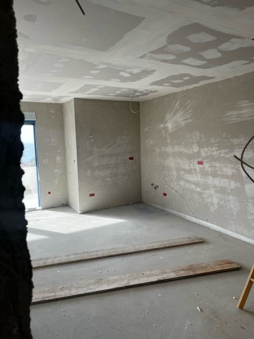 Penthouse 200m2 dvoetazni +terasa 100 m2 (balkona 2, 2 garazna mjesta , novogradnja (zavrsetak radova 1.6.2025god. 3.kat i zadnji . Pogled na more , niko Vas nemoze zaklonit , 90 metara do plaze.