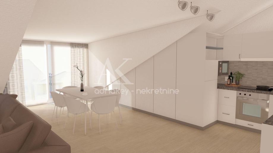 Donja etaža (prvi dio stana) površine cca 90 m2 nalazi se na zadnjem katu zgrade. Na ovoj etaži nalazi se prostrana dnevna soba povezana s modernom, otvorenom kuhinjom i blagovaonicom, pružajući idealan prostor za obiteljska druženja. Stan sadrži dvije udobne spavaće sobe, jednu potpuno opremljenu kupaonicu i dodatni WC. Ova etaža ima dvije lođe, savršene za opuštanje s pogledom na more i okolnu prirodu.