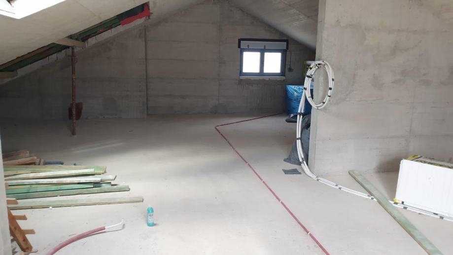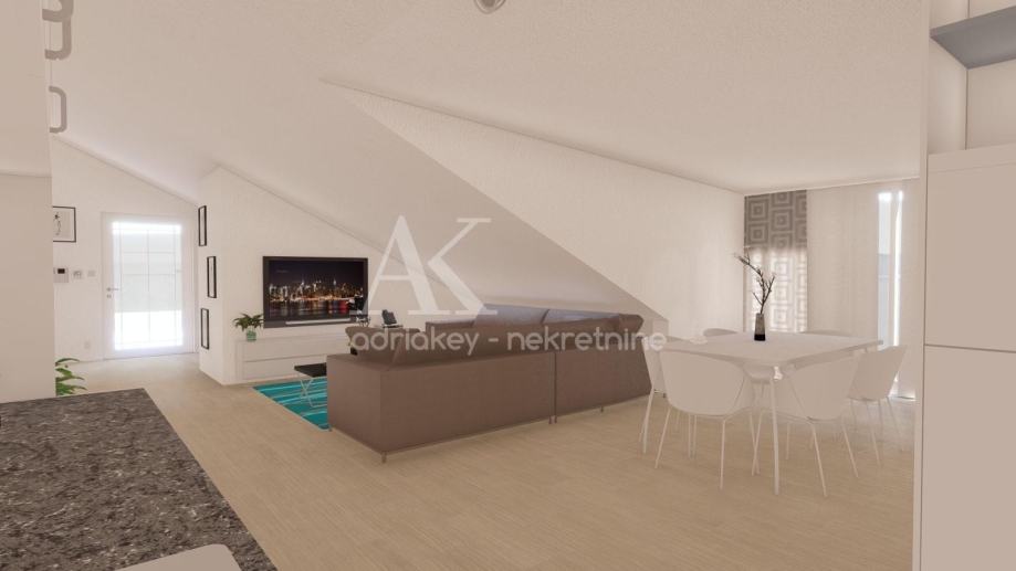 Gornja etaža (tavan), također površine cca 90 m2, sastoji se od dvije dodatne sobe. Jedna spavaća soba ima vlastitu privatnu kupaonicu, dok je druga soba idealna za goste ili kao radni prostor. Na tavanu se također nalazi druga kuhinja, dnevni boravak i blagovaonica, stvarajući dodatni funkcionalan prostor. Ovaj kat dolazi s velikom terasom od 100 m2, savršenom za sunčanje, druženja ili uživanje u panoramskom pogledu na more i okolne planine.