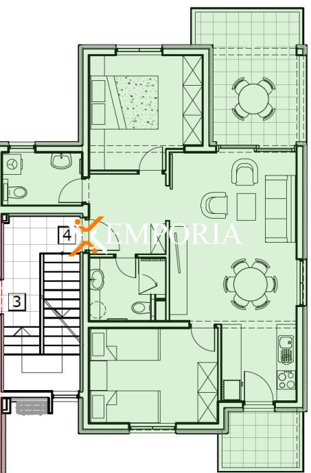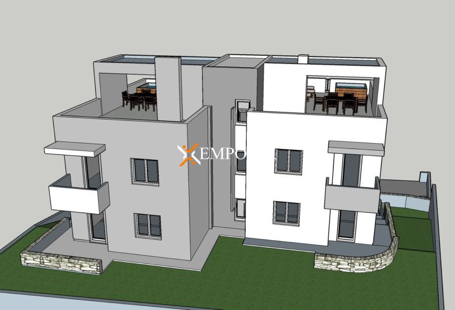 U zgradi se nalaze ukupno 4 stana. Udaljenost od centra mjesta iznosi svega 400 m.OpremaPodne obloge su pločice i parket. Fasada ima termoizolaciju od vune debljine 10 cm. Prozori su od PVC materijala s roletama, komarnicima i troslojnim staklom. Dnevni boravak i spavaće sobe su klimatizirane. U kupaonici se postavlja podno grijanje. Ulazna vrata su protuprovalna i protupožarna.