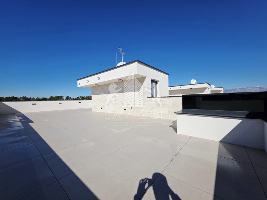 Krovna terasa zamišljena je kao reprezentativan vanjski dnevni prostor i izvedena je s travertino kamenom, koji značajno podiže estetsku vrijednost i dodatno modernizira cijeli objekt, dajući mu luksuzan i suvremen izgled. Na terasi se nalazi natkriveni dio predviđen za ljetnu kuhinju, čime je omogućeno ugodno korištenje prostora tijekom cijelog dana, a izvedene su i instalacije za jacuzzi, što dodatno naglašava ekskluzivni karakter ovog penthouse apartmana na Viru. Velika površina terase omogućuje uređenje zona za sunčanje, druženje i opuštanje uz potpunu privatnost. Apartmanu pripadaju i dva vanjska parkirališna mjesta, što je iznimna prednost za nekretninu u blizini mora i centra.