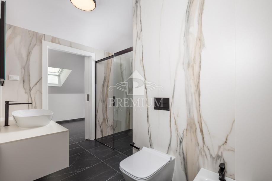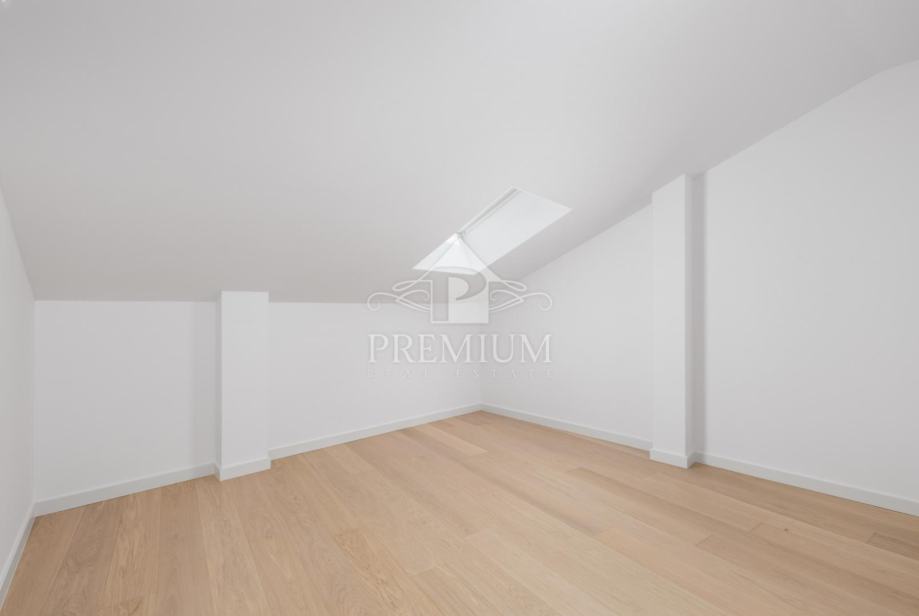 Stan se sastoji od tri spavaće sobe, dnevnog boravka sa kuhinjom i blagovaonom, tri kupaonice, wc-a, garderobe, hodnika i tehnike ukupne stambene površine 233,61 m2 kojem pripada sporedni dio terasa i dva balkona ukupne površine 84,95 m2 što daje ukupnu površinu stana u potkrovlju 318,56 m2.