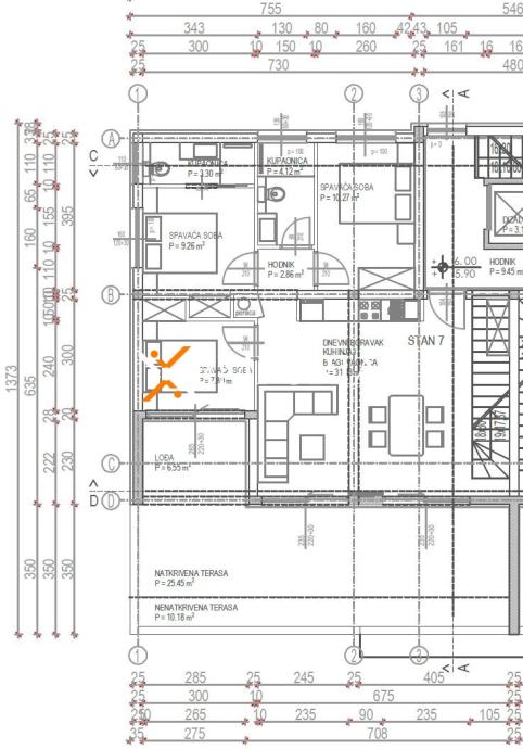 Dies ist eine Wohnung im zweiten Stock. Raumaufteilung besteht aus einem Flur, 2 Schlafzimmer, Schlafzimmer mit Bad, Badezimmer, Küche mit Ess- und Wohnzimmer sowie einer überdachten Terrasse. Aus der Wohnung gelangt man auf die zu dieser Wohnung gehörende Dachterrasse. Die Fläche der Dachterrasse beträgt 102,32 m2. Auf der Dachterrasse befindet sich ein 15,30 m2 großer Swimmingpool. Nettonutzfläche der beschriebenen Räume mit Terrassen beträgt 130,05 m2. Außerdem verfügt die Wohnung über zwei Parkplätze.