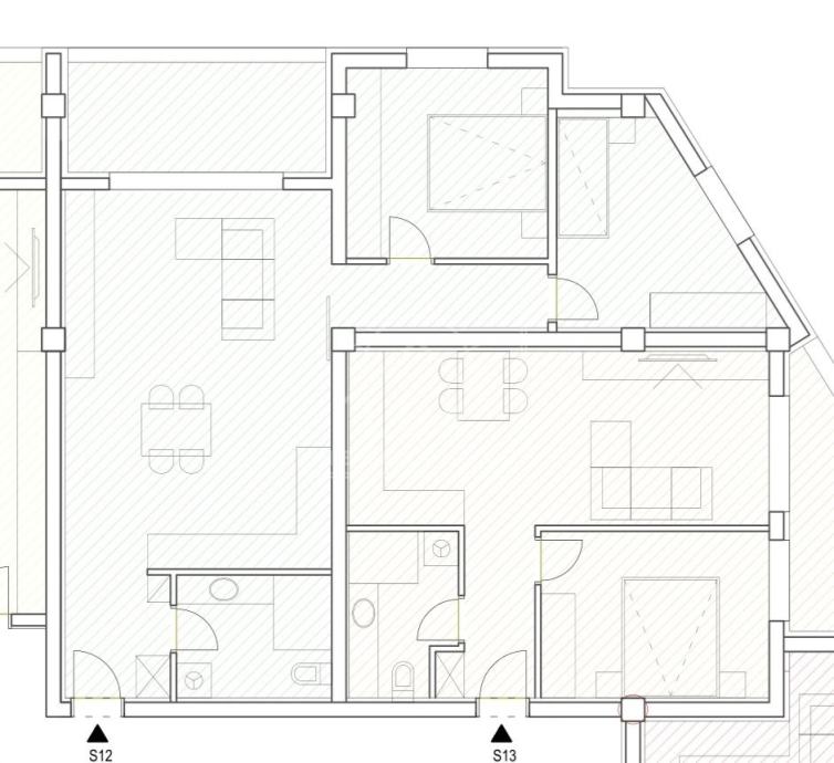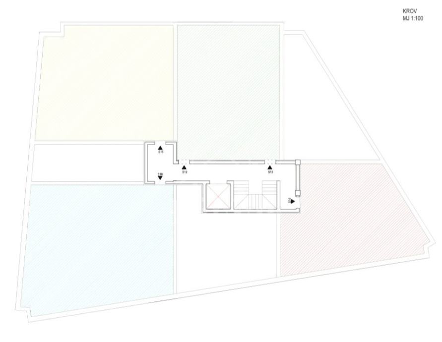 STAN S12 na 3. katu S KROVNOM TERASOM, dvosoban, sastoji se od hodnika, kuhinje s blagovaonicom i dnevnim boravkom (pov. 30 m2), dvije spavaće sobe (pov. 11.40 m2 i 8.45 m2), kupaonice (pov. 5.69 m2) i loggia-e (pov. 7.74 m2 x 0.75 = 5.81 m2).