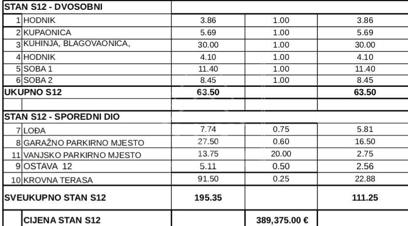 Stanu pripadaju i 2 garažna parkirna mjesta (pov. 13.75 x 0.60 x 2 = 16.25 m2), ostava (pov. 5.11 m2 x 0.50 = 2.56 m2) i KROVNA TERASA (pov. 91.50 m2 x 0.25 = 22.88 m2).
