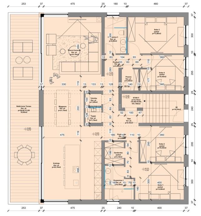 Stan se sastoji od ulaznog prostora koji vodi u prostrani dnevni boravak povezan s blagovaonicom i kuhinjom. Iz dnevnog dijela omogućen je izlaz na natkrivenu terasu površine 36 kvadratnih metara, idealnu za opuštanje tijekom cijele godine. Penthouse uključuje četiri udobne spavaće sobe, dvije moderno uređene kupaonice opremljene visokokvalitetnim sanitarijama, odvojeni toalet te praktičan prostor za garderobu koji omogućuje dodatnu organizaciju i pohranu.