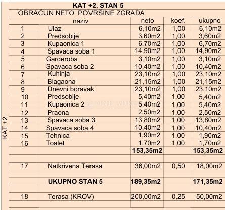 Poseban adut ove nekretnine je krovna terasa površine 200 kvadratnih metara, koja pruža mogućnost uređenja jedinstvenog privatnog vanjskog prostora prema željama budućeg vlasnika. Uz stan dolaze dva privatna parkirna mjesta.