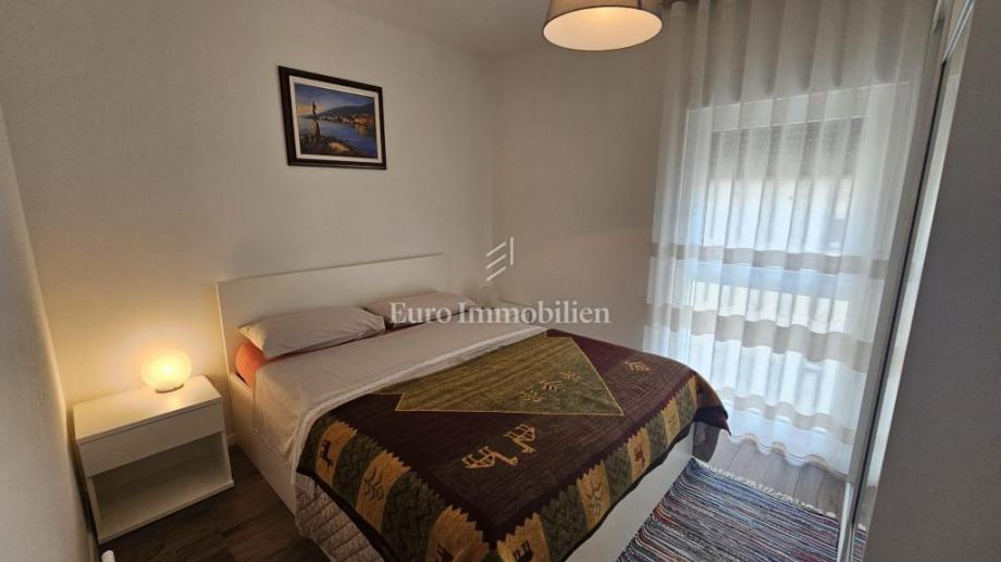 Penthouse je smješten na prvome katu, a sastoji se od ulaznog stepeništa, hodnika, 3 spavaće sobe, dvije kupaonice, prostranog dnevnog boravka, kuhinje i blagavaonice te velike loggie. Sa loggie, natkrivenim stepeništem se dolazi na vrh na kojoj je smještena krovna terasa s koje se pruža panoramski pogled na more.