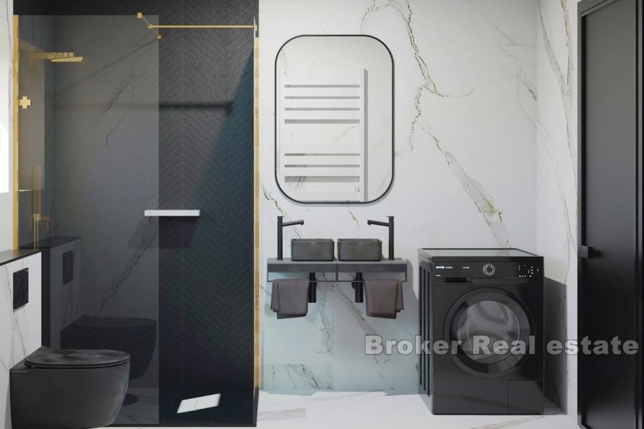 Stan ukupne neto korisne površine 120 m2 sastoji se od tri spavaće sobe od kojih je jedna s vlastitom kuponicom, dvije kupaonice, kuhinje, blagovaonice i dnevne sobe. Iz zajedničkih prostorija nudi se izlaz na prsotranu lođu, dok privatne stepenice u stanu vode do krovne terase s jacuzzijem.