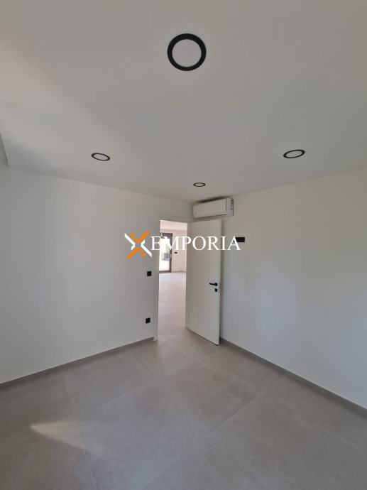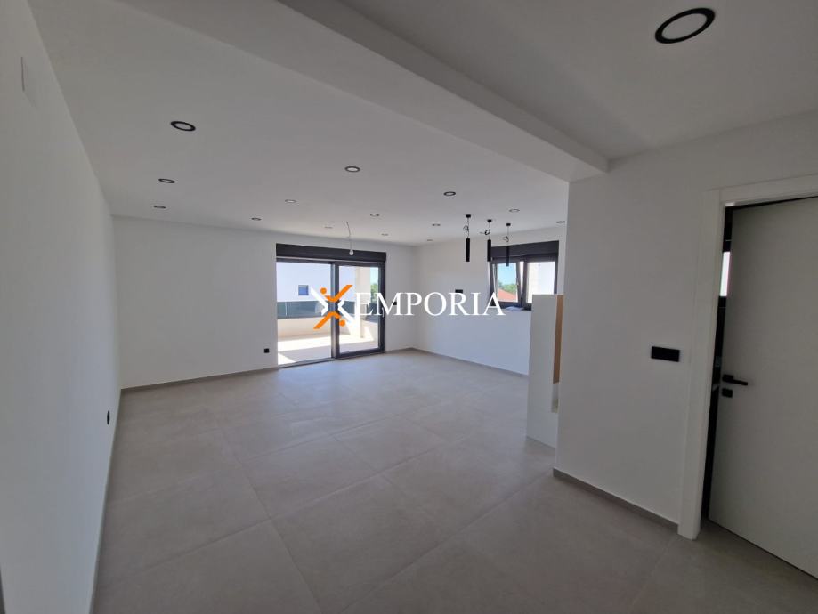 Unutarnji raspored obuhvaća hodnik, dvije spavaće sobe (od kojih jedna ima vlastitu kupaonicu), dodatnu kupaonicu, kuhinju s blagovaonicom i dnevnim boravkom te natkrivenu terasu (70,88 m²). Iz stubišta se pristupa krovnoj terasi površine 79,89 m², koja je dijelom natkrivena i ima pripremu za pergolu (strujni priključak i nosači konstrukcije).OpremaApartman ima podno električno grijanje u kupaonicama te tri klima jedinice (dnevni boravak + spavaće sobe). Stolarija je PVC s troslojnim staklom, električnim roletama i komarnicima. Podovi su obloženi keramikom dimenzija 90x90 cm u cijelom apartmanu i na terasama (na terasama dodatno debljina 2 cm).