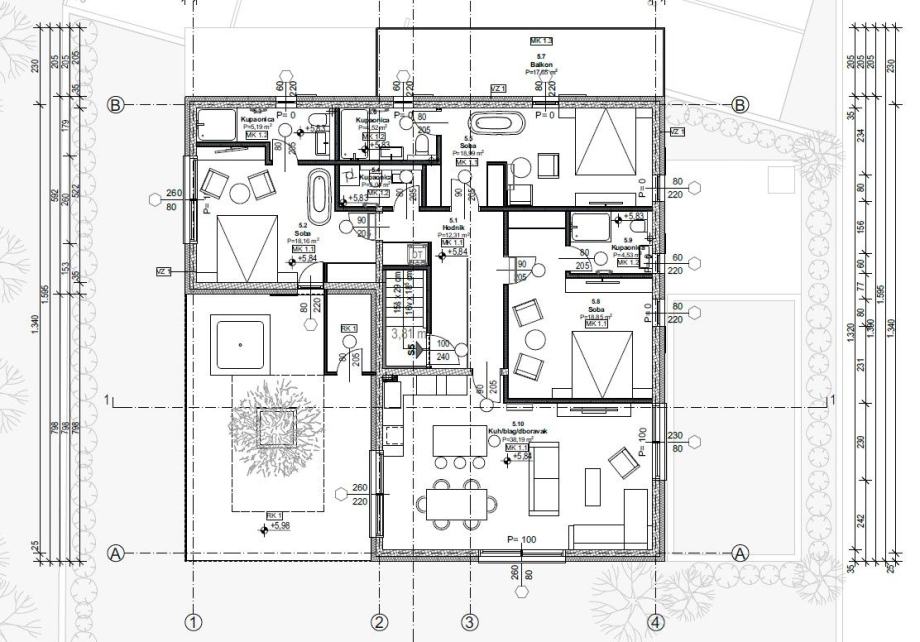 S5- Penthouse ukupne veličine 165,54m2 nalazi se 2.katu zgrade i sastoji se od STAMBENOG DIJELA površine 126,81m2 (hodnik, četiri spavaće sobe, četiri kupaonice, dnevni boravak, kuhinja i blagovaonica i SAUNA), TE VANJSKOG DIJELA dva parking mjesta – 25m2, terasa 40.97m2 i balkon 17.65m2.