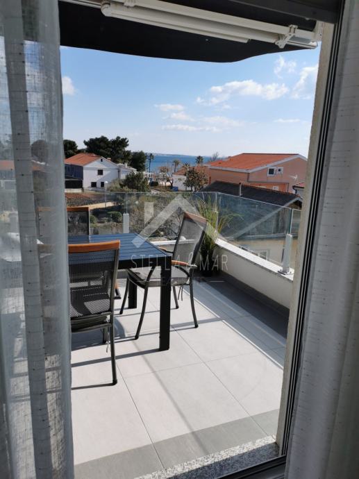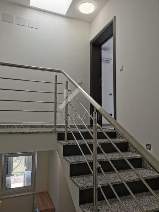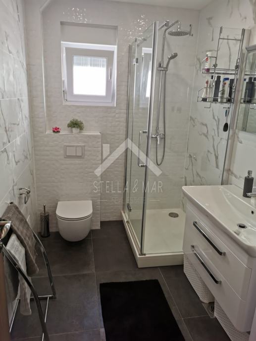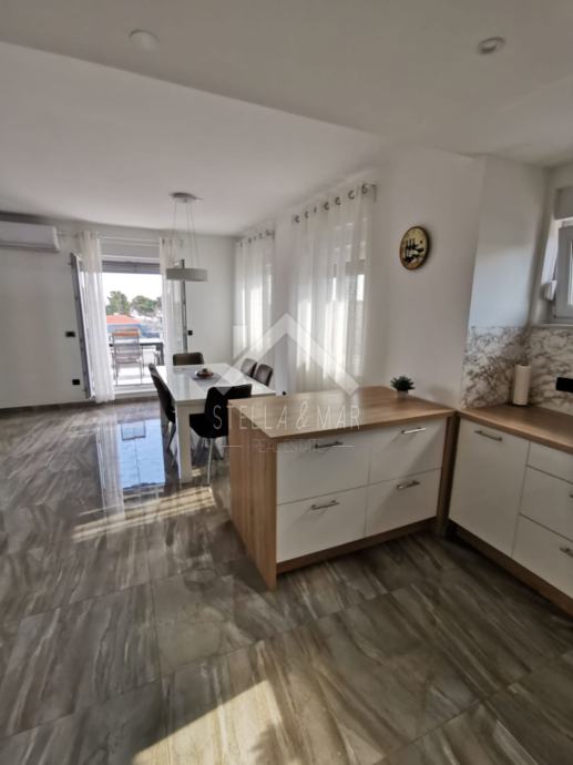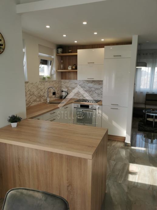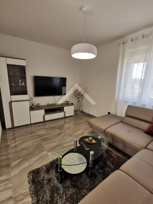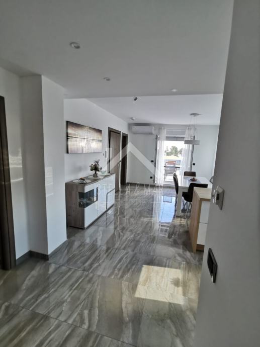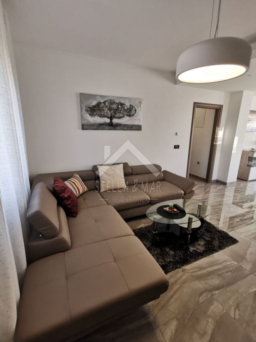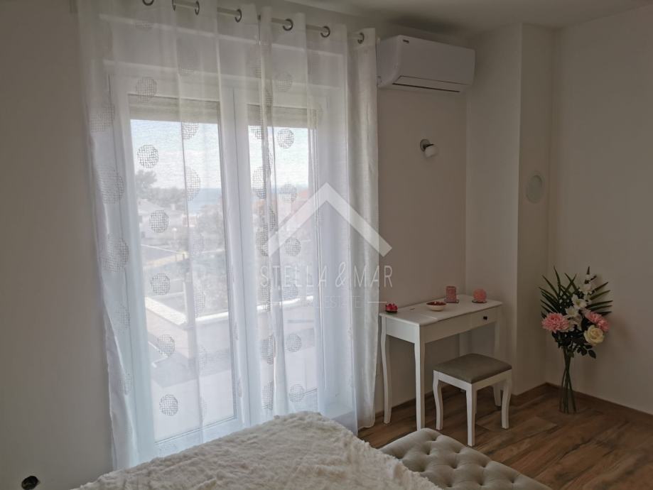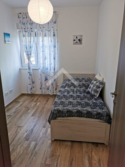 Apartman je površine 97,15m2 i sastoji se od dnevnog boravka sa kuhinjom, blagovaonom, tri spavaće sobe, kupaonom i WC-om te prekrasnom terasom duž cijele etaže sa koje se pruža nesmetan pogled na more. Apartman je kompletno namješten te se takav i prodaje.