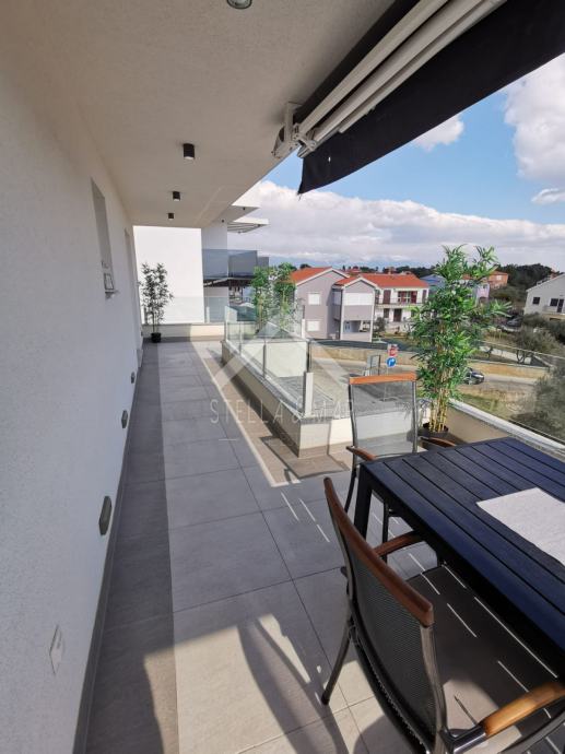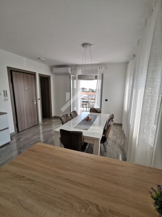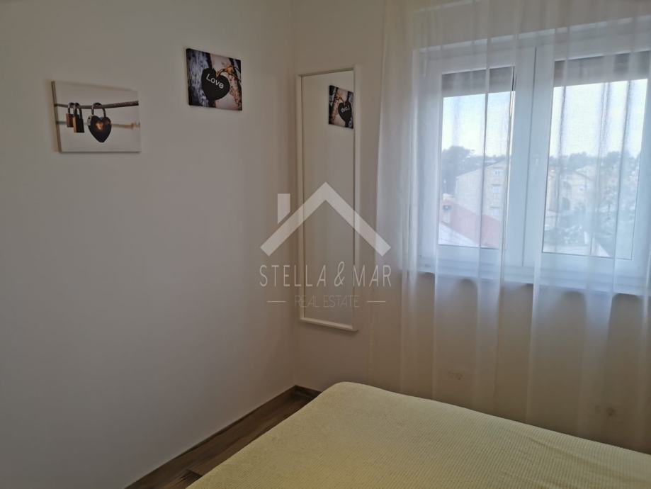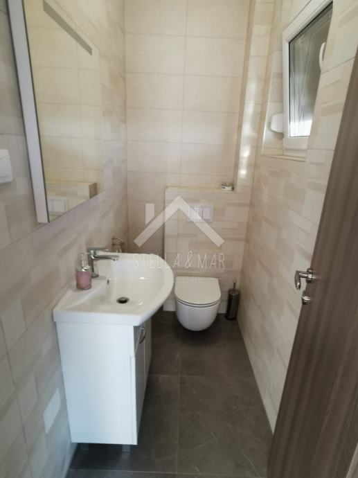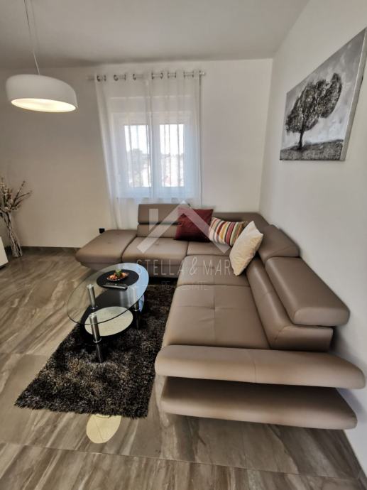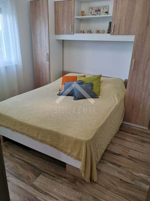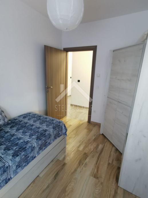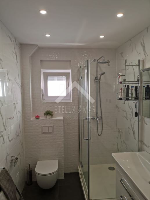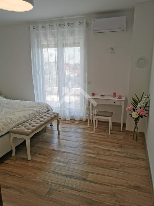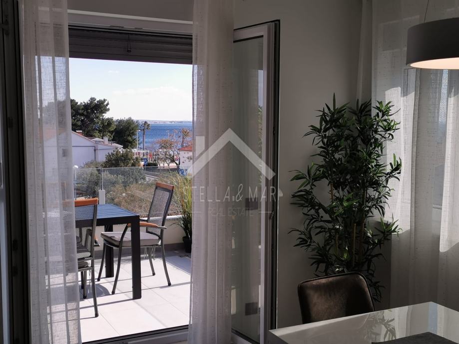 Apartman je površine 97,15m2 i sastoji se od dnevnog boravka sa kuhinjom, blagovaonom, tri spavaće sobe, kupaonom i WC-om te prekrasnom terasom duž cijele etaže sa koje se pruža nesmetan pogled na more. Apartman je kompletno namješten te se takav i prodaje.
