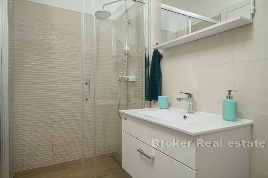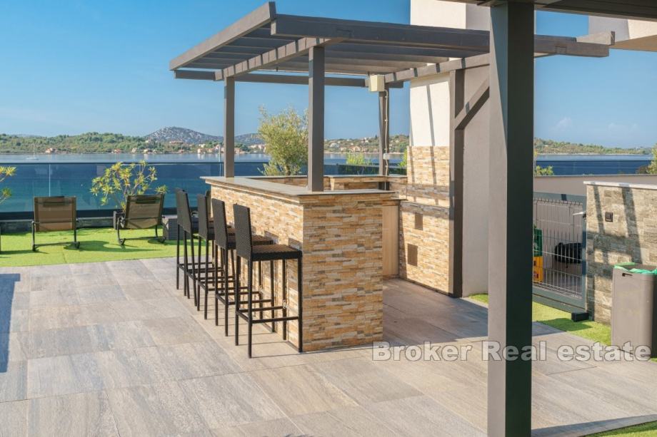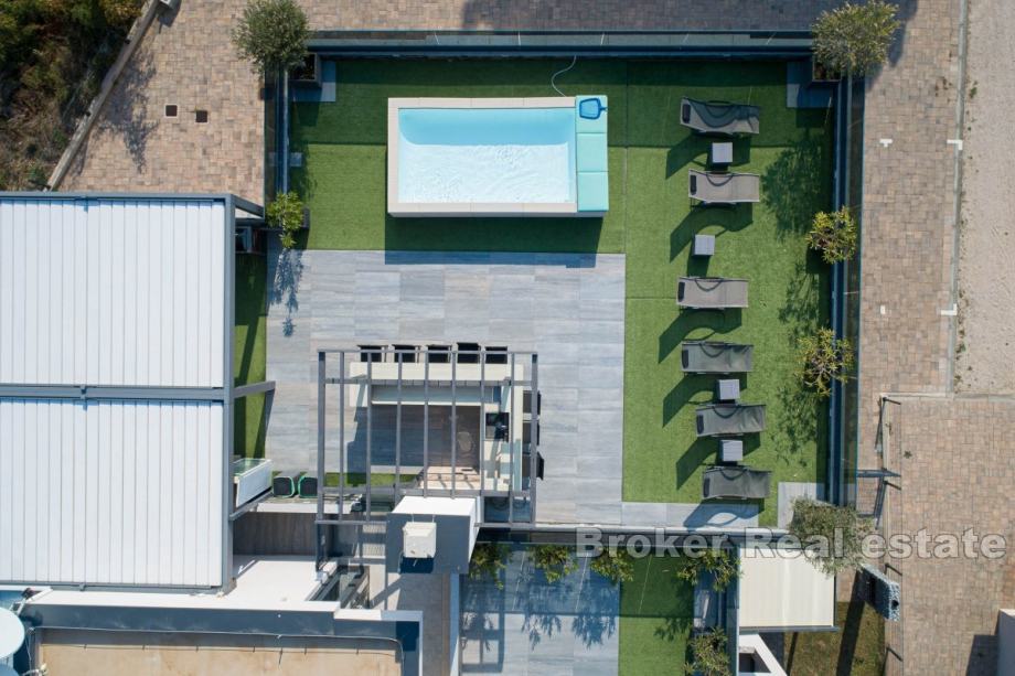 Uz to, nekretnina uključuje terasu, balkon i dva parkirna mjesta ukupne površine 49,3 m². Krovna terasa od 115 m² nudi prostor za opuštanje s malim bazenom od 8 m², barom i roštiljem, idealnim za uživanje u ljetnim danima.