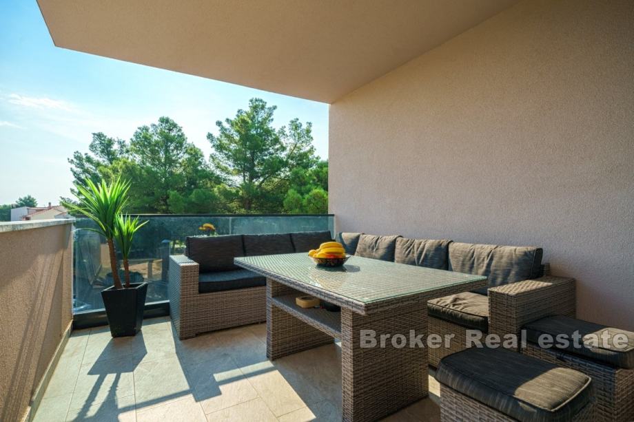 Na prodaju je luksuzni penthouse s panoramskim pogledom na more, smješten u blizini plaže i svih ključnih sadržaja. Ukupna stambena površina iznosi 93,72 m² i obuhvaća hodnik, predprostor, dnevni boravak, kuhinju s blagovaonicom, četiri spavaće sobe, radnu sobu i dvije kupaonice.
