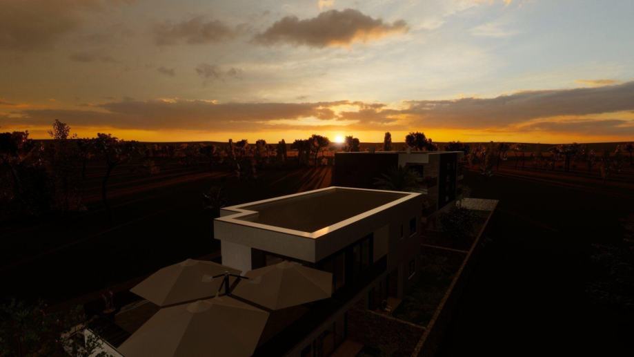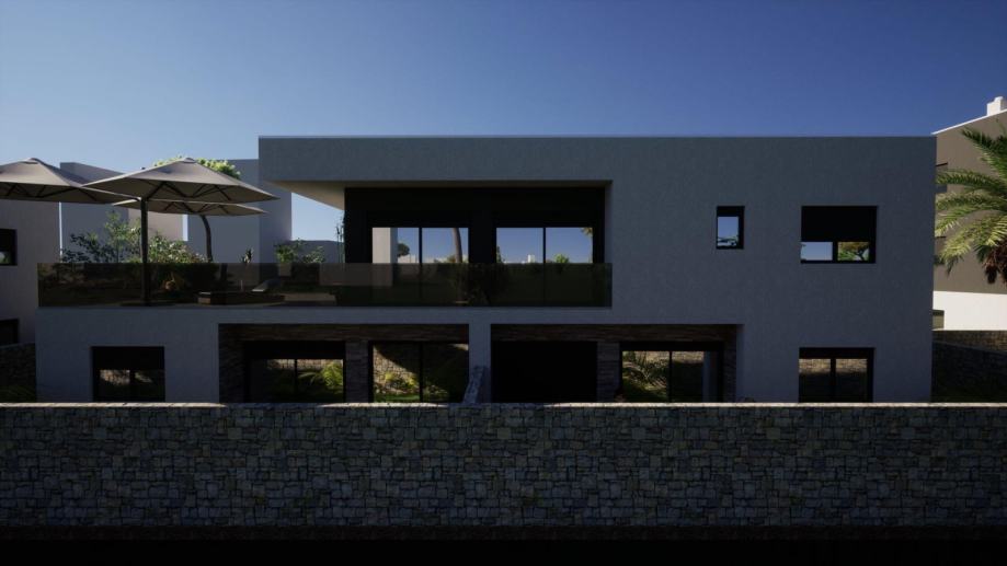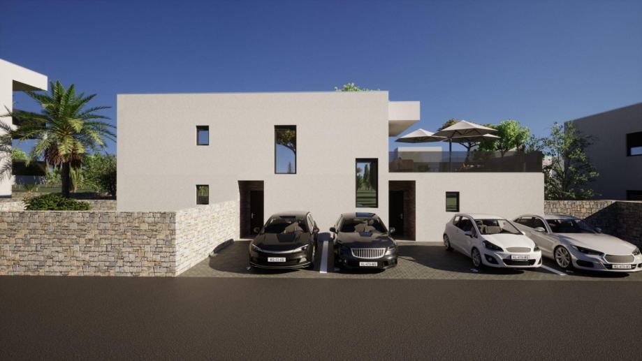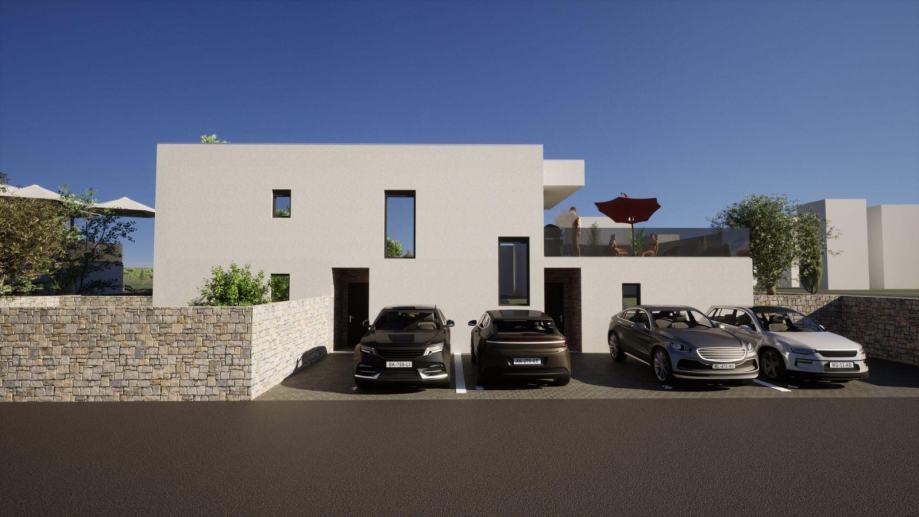 Ovaj suvremeni stan sastoji se od otvorenog dnevnog prostora koji objedinjuje kuhinju i blagovaonicu, dvije spavaće sobe, jedne kupaonice, zasebnog wc-a, hodnika, te prostrane djelomično natkrivene terase s pogledom na more.