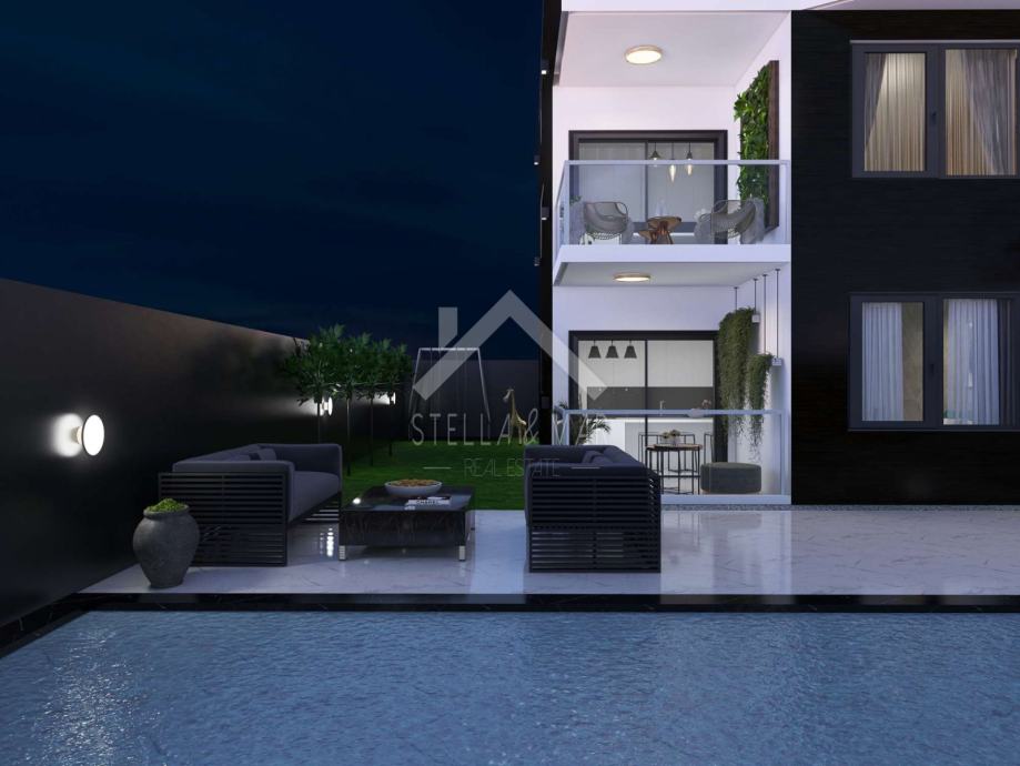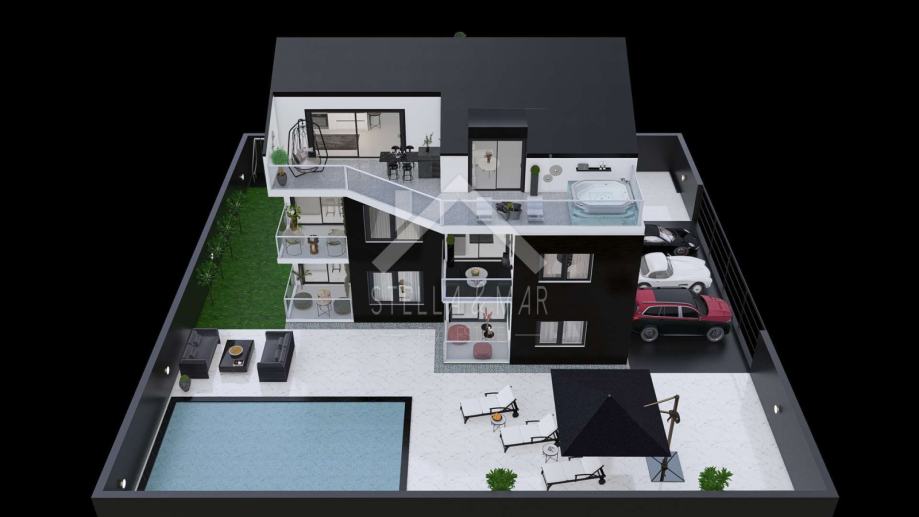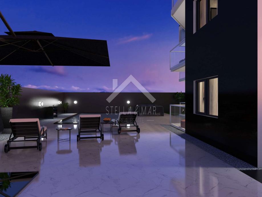 Penthouse se nalazi na drugom katu zgrade, površine je 106m2. Sastoji se od Prostranog dnevnog boravka sa kuhinjom i blagovaonom, tri spavaće sobe, dvije kupaone, natkrivene terase.