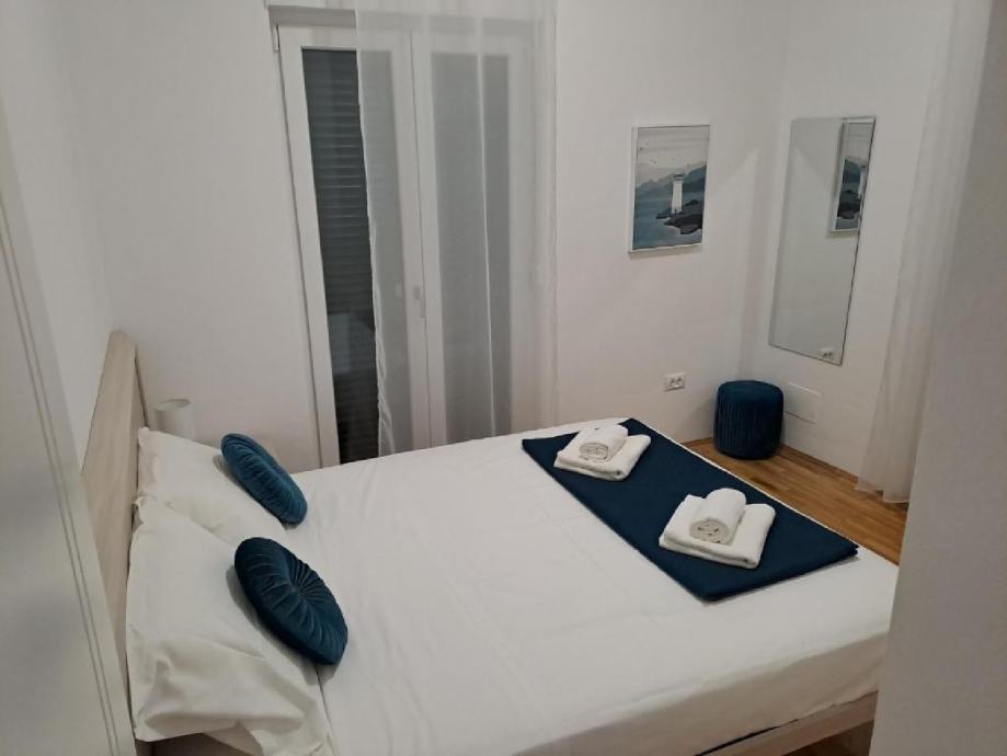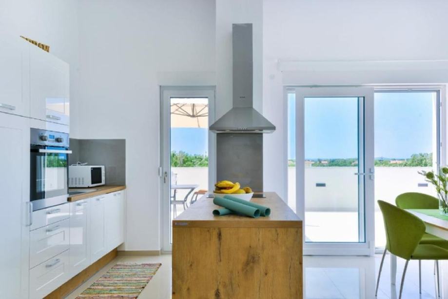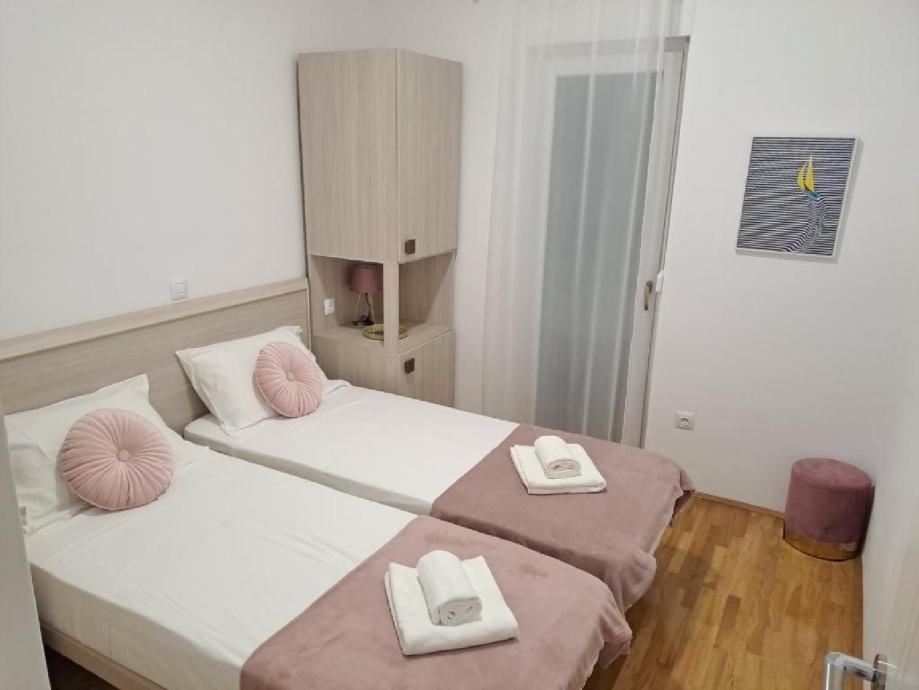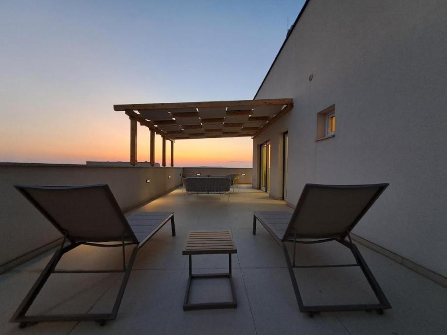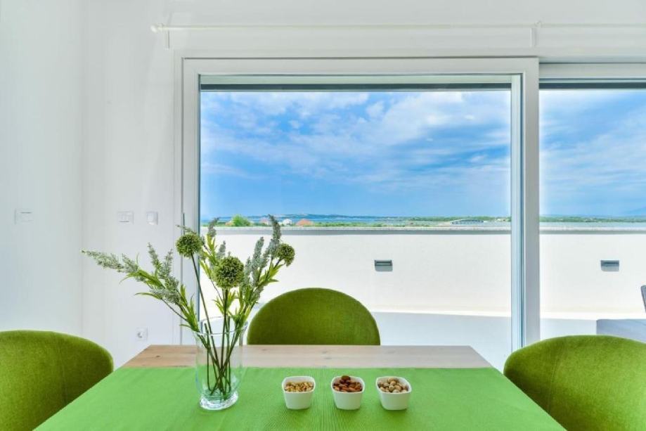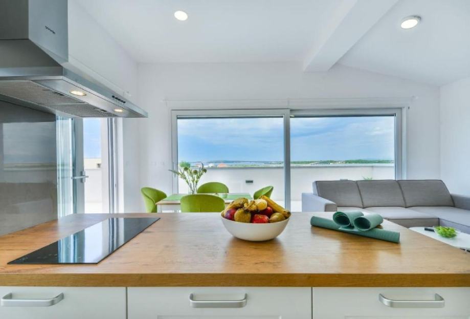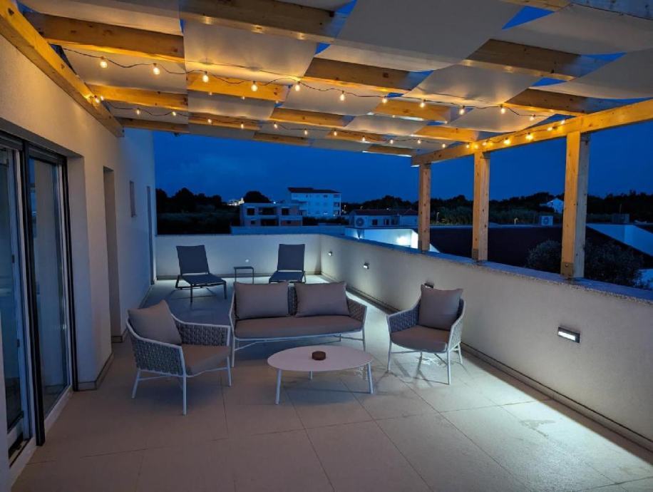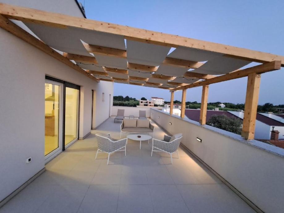 Stan je na drugom katu zgrade novije gradnje, jedini stan na tom katu. Stan ima 2 spavaće sobe, wc/kupaonu, te su kuhinja, dnevni boravak i blagavaona u zajedničkoj prostoriji. U dnevnom boravku nalaze se 2 velike staklene stijene od kojih jedna ide po cijeloj dužini zida, što osigurava puno prirodnog svjetla u stanu. Terasa je poprilično velika, cca 60m2, te je dostupan prekrasan pogled na more i na Velebit. Na terasi se nalazi set za terasu (2 ležaljke, 2 stolca, klupa i stolić) te je također postavljena pergola koja daje cca 20m2 hlada.
