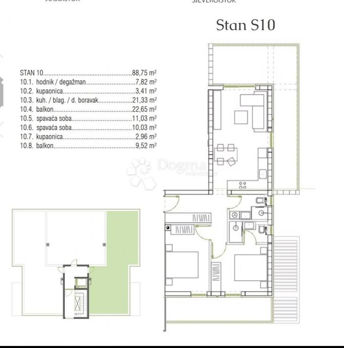 - 2 spavaće sobe (11,03 m² i 10,03 m²)