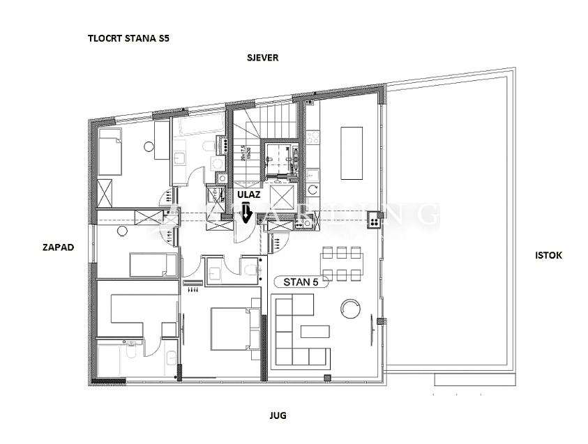 Stan se sastoji od dnevnog boravka, kuhinje i blagovaonice, tri spavaće sobe od kojih jedna ima garderobu i kupaonicu, kupaonice s wc-om, odvojenog wc-a, ulaznog prostora i terase bruto korisne površine 60,15 m2.