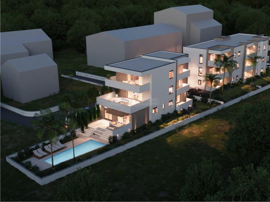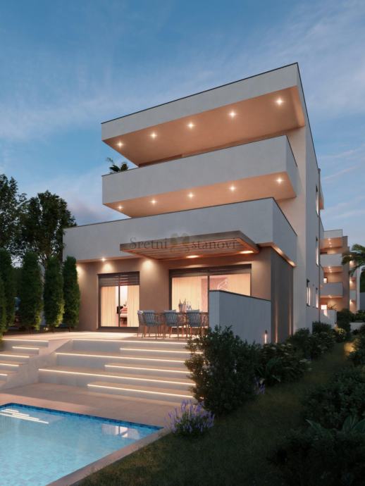 Prodaje se luksuzan stan (penthouse) u modernoj, manjoj novogradnji (prizemlje + 2 kata) u Vodicama, na lijepoj i mirnoj lokaciji sjeverno od Osnovne škole Vodice. Zgrada se nalazi na nešto manje od 5 minuta vožnje do mora i centra grada.