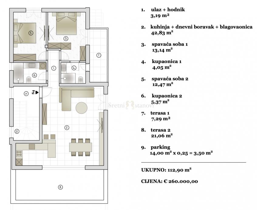 Stanu pripada i vanjsko parkirno mjesto od 14 m2. Moguće je kupiti dodatno parkirno mjesto.