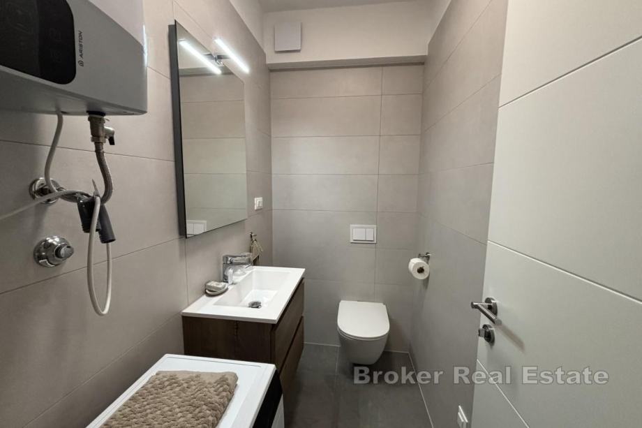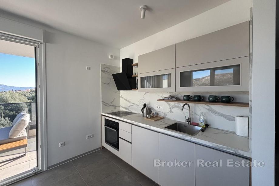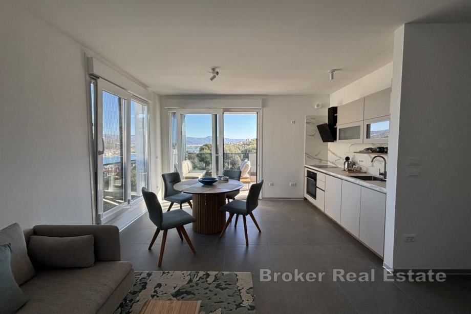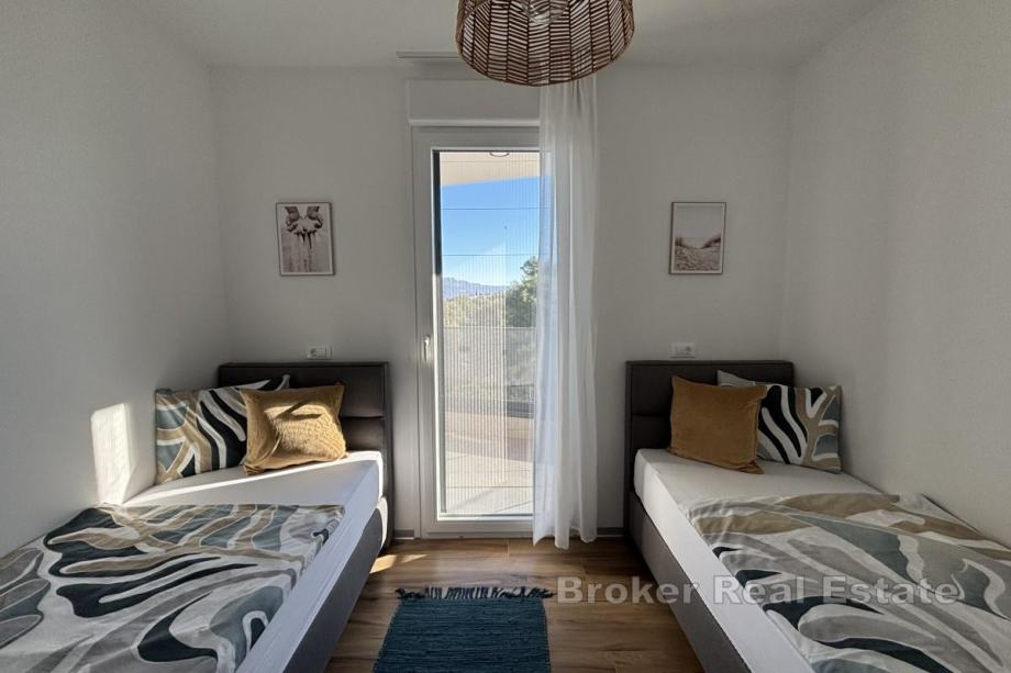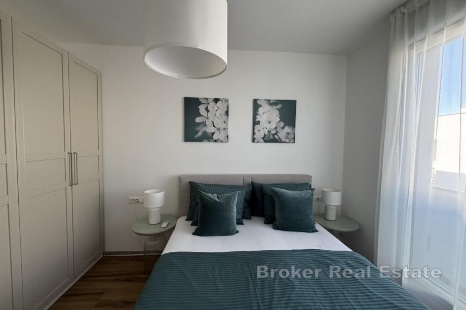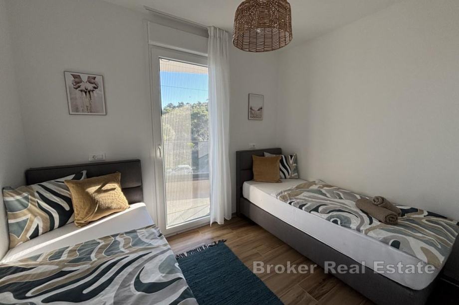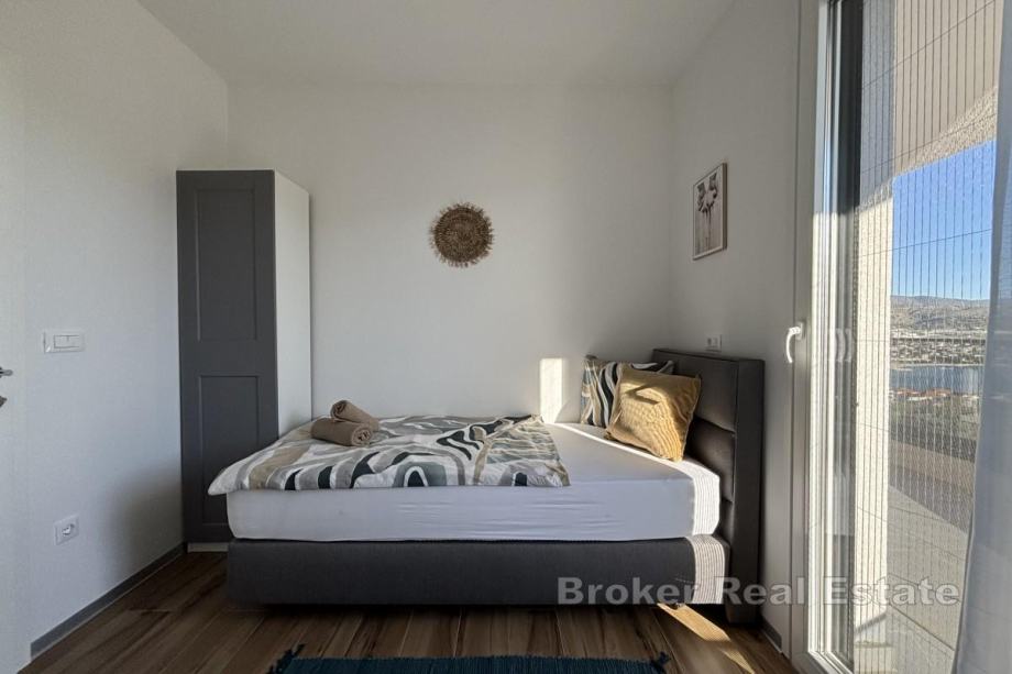 Penthouse je smješten na prvom katu novogradnje s dizalom suvremenog dizajna, orijentiran je prema sjeveroistoku, što osigurava dovoljno prirodne svjetlosti i prekrasan pogled na more u dnevnom dijelu. Stan raspolaže s 56,28 m² stambene površine i sastoji se od hodnika, dvije spavaće sobe, od kojih jedna ima izlaz na balkon površine 17,50 m², kupaonice te kuhinje, blagovaonice i dnevnog boravka koji su otvorenog koncepta i iz kojih se izlazi na prostrani balkon s pogledom na more. Najveća prednost ove nekretnine je prostrana krovna terasa površine oko 106 m² koja se dijeli s drugim penthouse stanom, a s koje se pruža spektakularan panoramski pogled na more i obližnje otoke – idealno mjesto za vanjsko druženje.