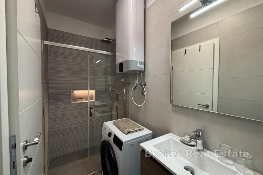 Zgrada je izgrađena korištenjem visokokvalitetnih materijala, a klimatizacija je osigurana putem tri klima uređaja te podnog grijanja u kupaonici. Od dodatne opreme ističu se protuprovalna vrata, komarice, električni podizači roleta te kvalitetan namještaj i oprema u stanu koji dolaze uz njega. U podrumu zgrade se nalazi pripadajuće garažno parkirno mjesto.