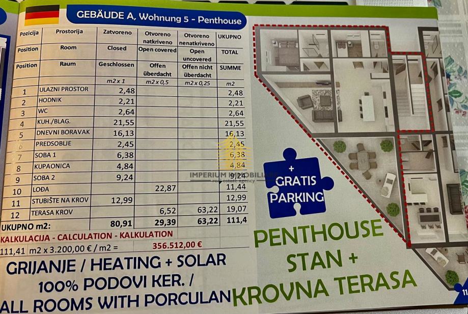 Penthouse apartmani opremljeni su podnim grijanjem u stanu na toplinsku pumpu. Topla voda se grije solarnim sustavima na krovu i električnim bojlerom. Podovi su opremljeni porculanskim keramičkim pločicama u sobama i kupaonicama. Svaki penthouse ima zaseban pristup krovnoj terasi, koja se može koristiti u privatne svrhe.