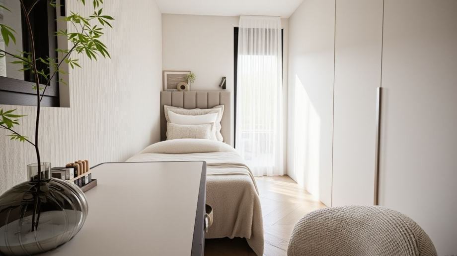 Sastoji se od kuhinje, blagovaonice i dnevnog boravka otvorenog prostora, 2 spavaće sobe, 2 hodnika, 2 kupaonice, ostave i terase Orijentiran jug-istok.