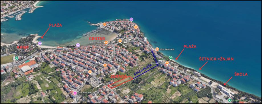 Udaljenost od plaže 250 m, od centra mjesta 350 m, a svi ostali sadržaji za život (škola, vrtić, trgovine, park) udaljeni max 500 m.