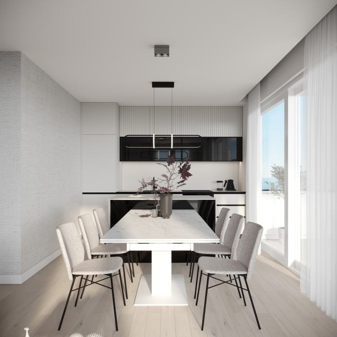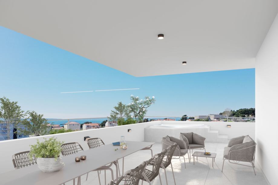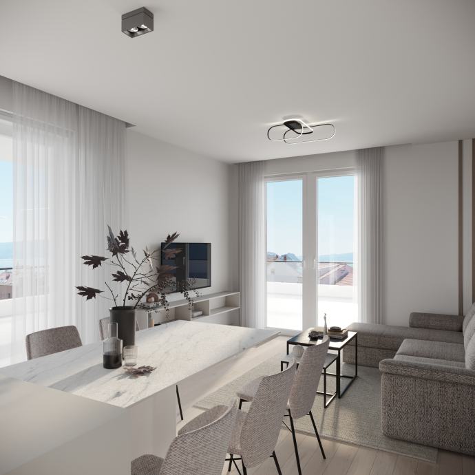 Prekrasan penthause s pogledom na more u novogradnji. Garaža s 2 GPM povezana liftom direktno u stan.