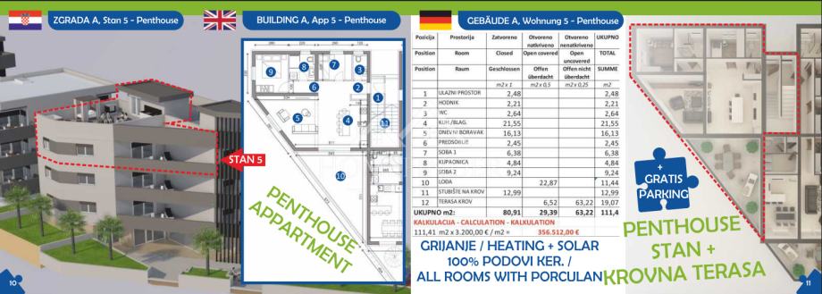 Na prodaju je ekskluzivan penthouse ukupne neto površine 111,4 m², koji se proteže na zadnjem katu zgrade, uz dodatnu pogodnost – privatnu krovnu terasu idealnu za opuštanje i uživanje u pogledu.