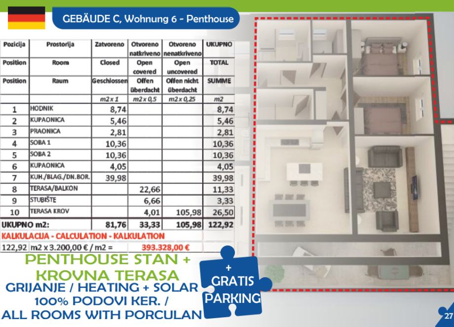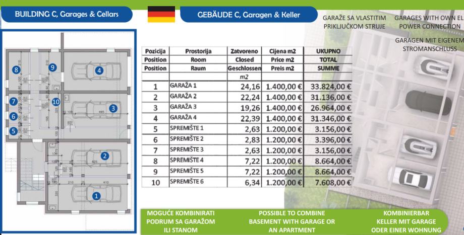 Sve 3 zgrade su građene kvalitetnim sustavom gradnje i sastoje se od protupotresne armirano betonske konstrukcije. Unutarnji zidovi i stropovi su izvedeni fino glatkim površinama uz milimetarsku toleranciju. Vanjski zidovi su kvalitetno izolirani sa 10cm termoizolacije, te sadrže pored klasične žbuke i vodoodbojnu završnu žbuku u boji. Sve zgrade posjeduju energetski cerfikat A+. Svi stanovi su opremljeni visokokvalitetnim PVC prozorima i vrama sa ALU roletama na struju, te rolo komarnicima. Vanjska stolarija je kvalitetno ugrađena po sistemu RAL i izolirana, te su ugrađena ISO stakla punjena plinom. Svaki stan ima zaseban priključak vode i struje sa dovoljno snage prema površini stana. Elektroinstalacije su izvedene prema najvišem standardu, te sadrže modernu seriju prekidača i učnica proizvođača TEM Modul. Unutarnja i vanjska rasvjeta je riješena sa LED tehnologijom. Svaki stan ima mogućnost spajanja vlastog telefonskog i internet priključka, ali može i zajedničku internet konekciju koris. Svaka zgrada posjeduje video nadzor, te vlasnici stanova dobiju pristup. Grijanje i hlađenje je riješeno pomoću kvalitetnih klima uređaja zasebno u svakom stanu. Grijanje tople vode se vrši pomoću vlastog bojlera u svakom stanu. Sanitarije i sanitarna oprema je ugrađena od renomiranih europskih proizvođača, te je spremna za korištenje. Stanovi se ne opremaju namještajem osim sanitarija i sanitarne opreme u kupaonicama. U kupaonicama su ugrađene vrhunske porculanske keramičke pločice. Podovi u svakom stanu su opremljeni vrhunskim porulanskim keramičkim pločicama, te su podovi u sobama opremljeni vodoodbojnim materijalom nalik laminata u imitaciji drveta. Penthouse stanovi u zgradi A i C su dodatno opremljeni podnim grijanjem u kompletnom stanu, koje je pogonjeno od dizalice topline. Topla voda se zagrijava pomoću solarnih sustava na krovu i električnog bojlera. Podovi su kompletno opremljeni porculanskim keramičkim ploičicama i u sobama. Svaki penthouse stan ima svoj izlaz na krovnu terasu, koju može koris u privatne svrhe.
