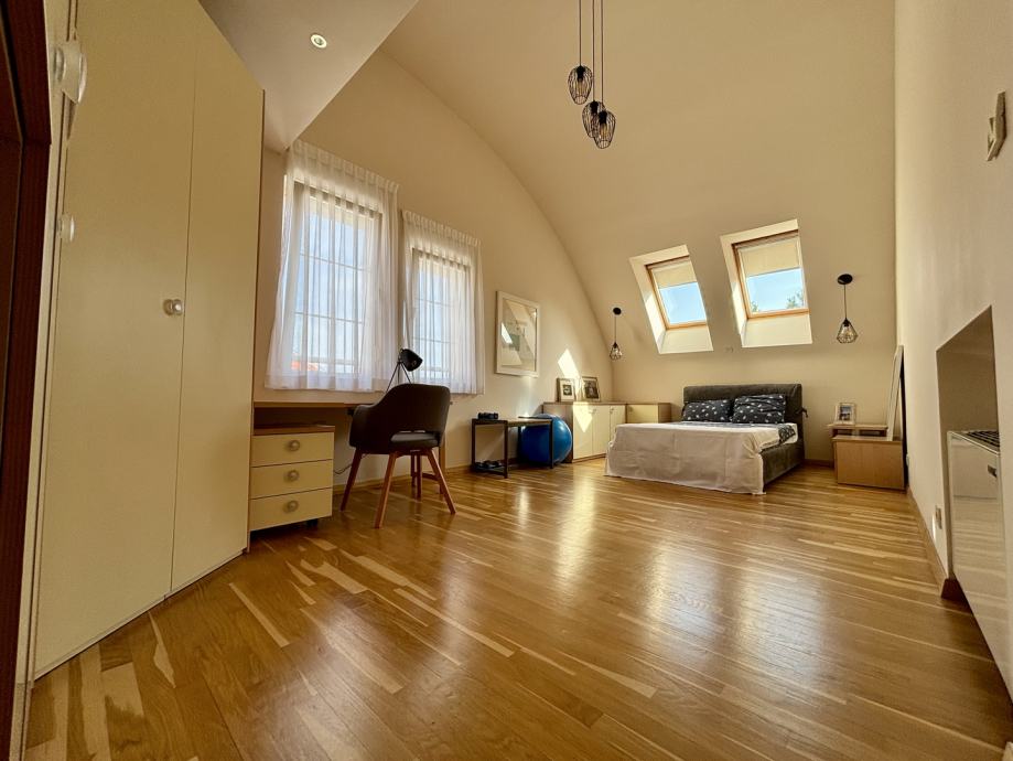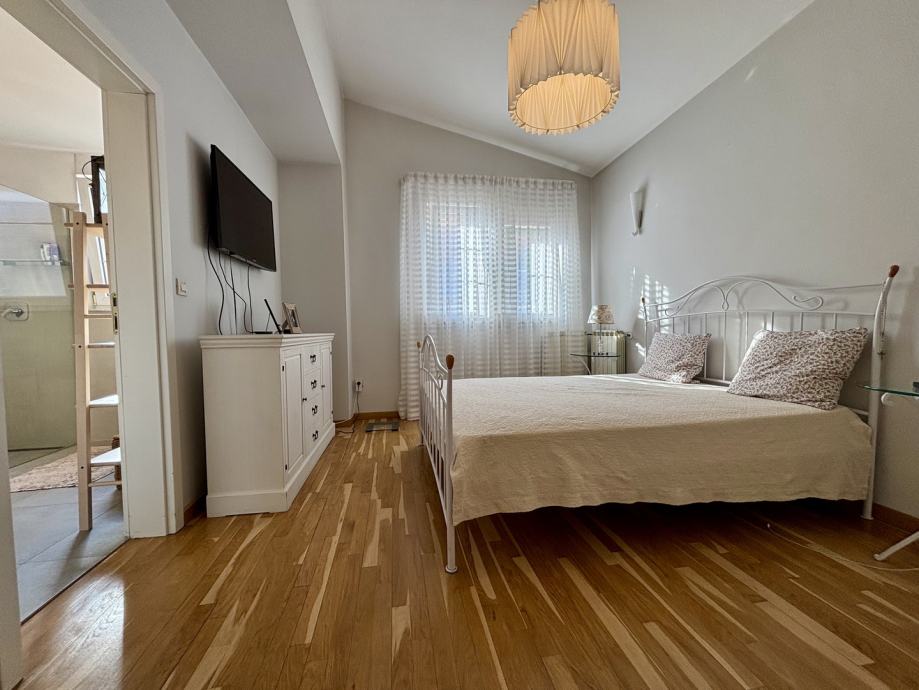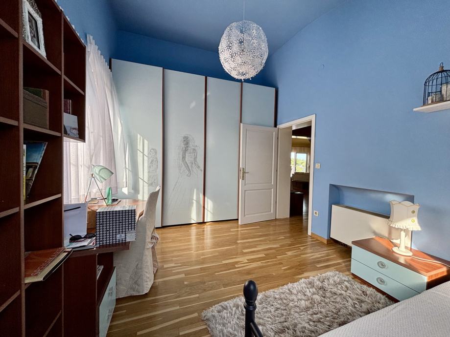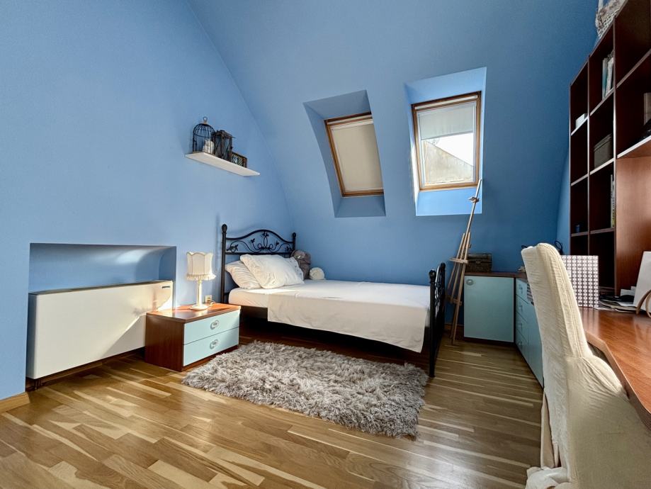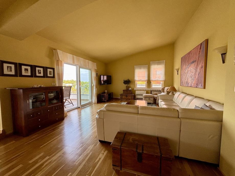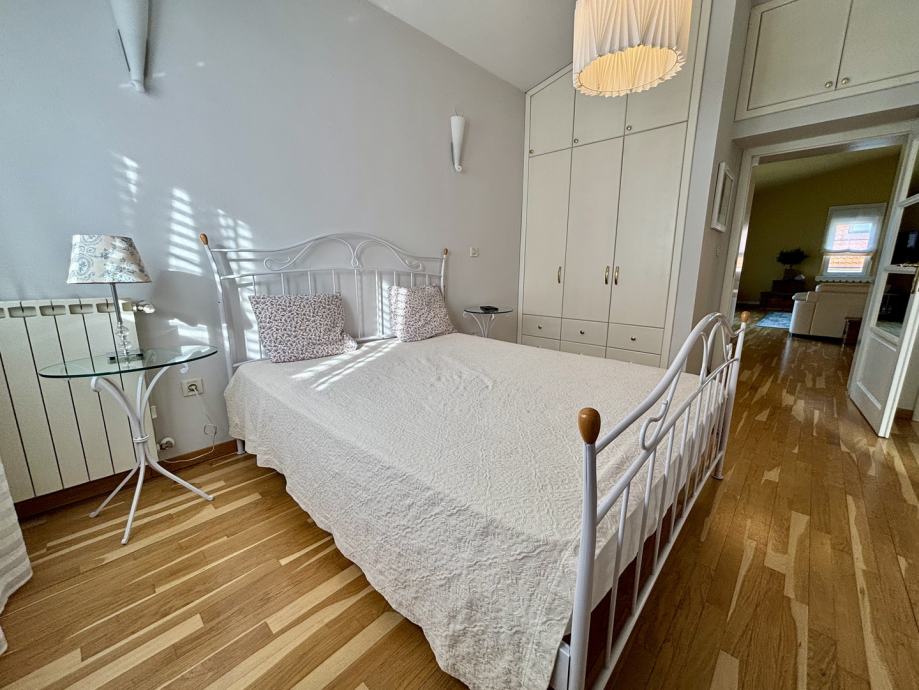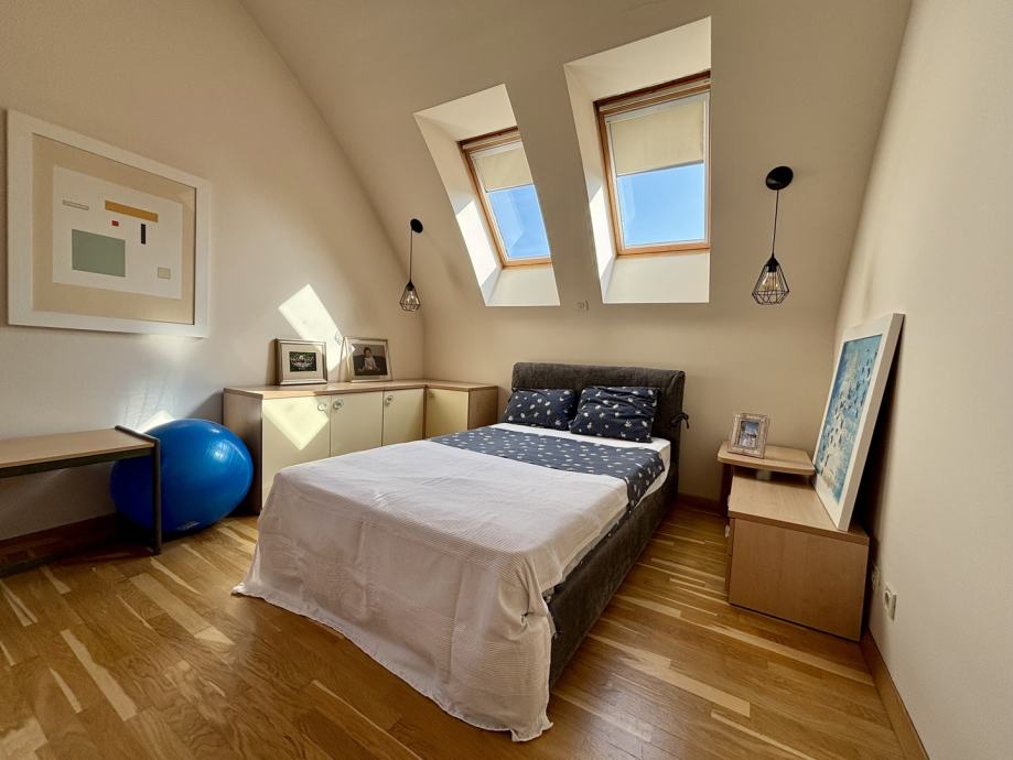 Ovaj četverosoban stan ističe se prostranošću i izuzetno povoljnim položajem na zadnjem katu, što pruža dodatnu privatnost i mir. Orijentacija stana na sve četiri strane svijeta – sjever, jug, istok i zapad – osigurava obilje prirodne svjetlosti tijekom cijelog dana te omogućava lijep pogled i vrlo sunčanu atmosferu. Stan se sastoji od tri spavaće sobe, prostranog dnevnog boravka, zasebne kuhinje i blagovaonice, velike terase, balkona, dvije kupaonice s WC-ima, predsoblja, tavana i podruma, kao dodatne prostorije koje nude praktičnost i fleksibilnost za različite potrebe skladištenja stvari.