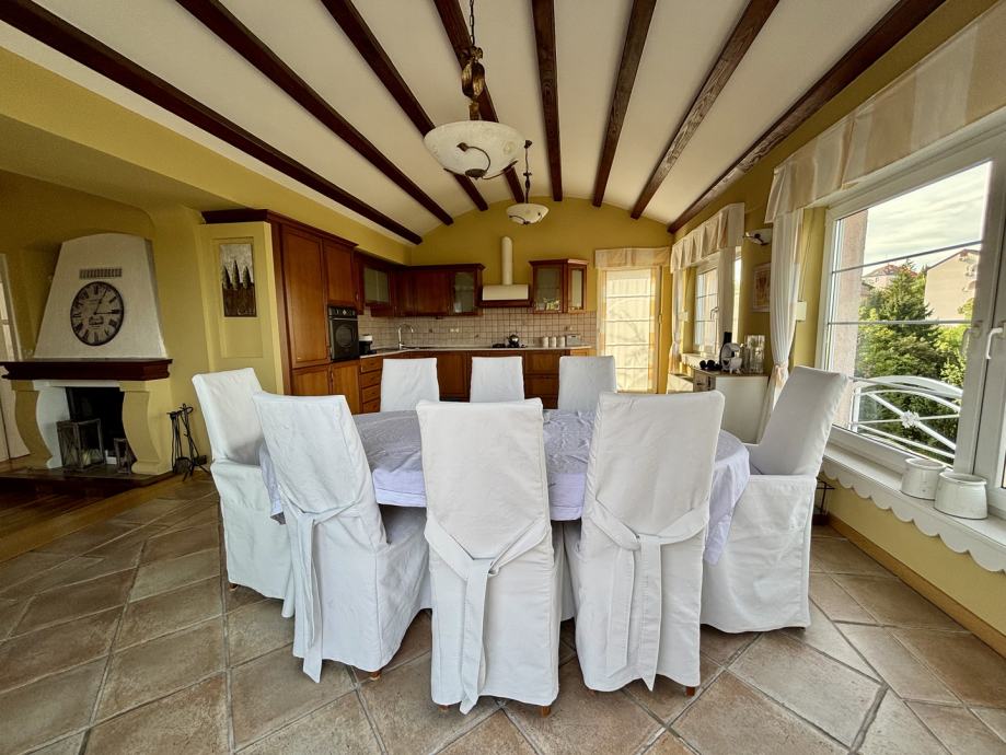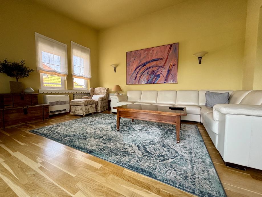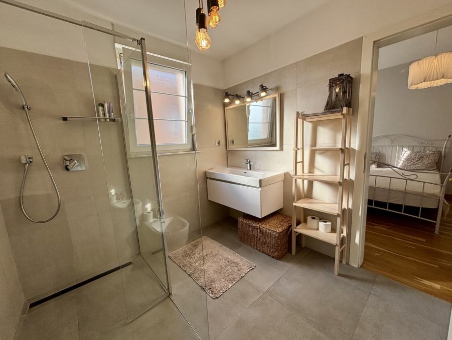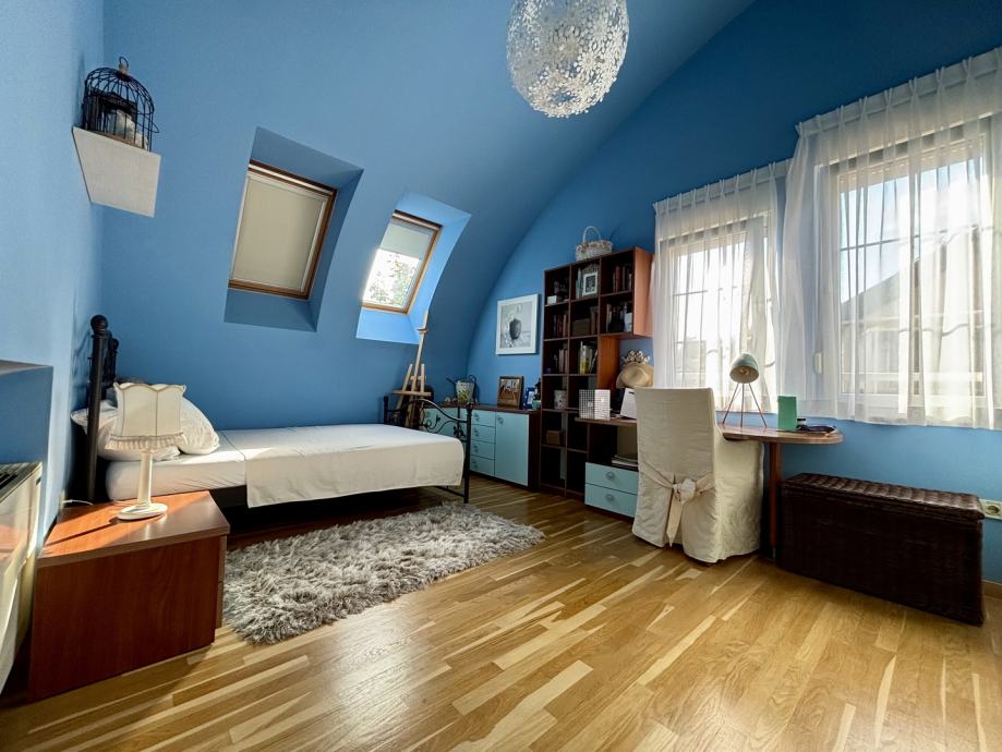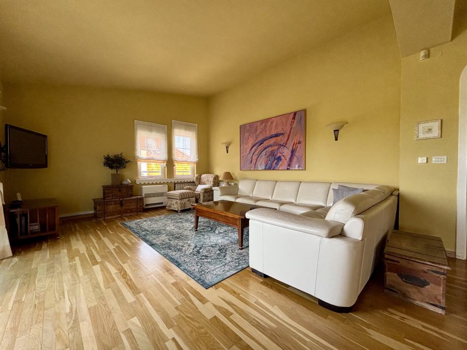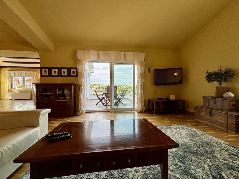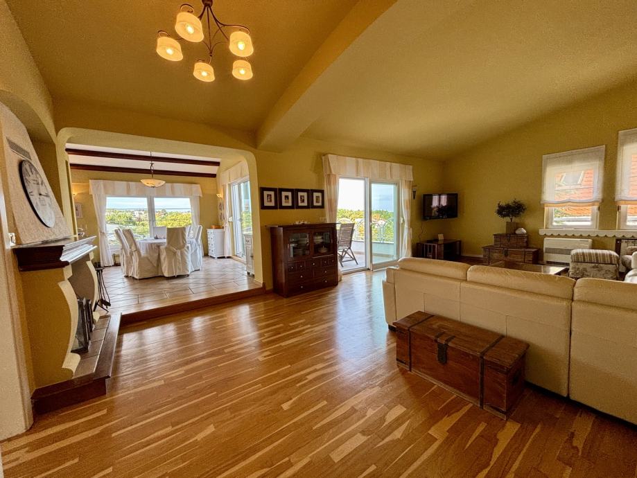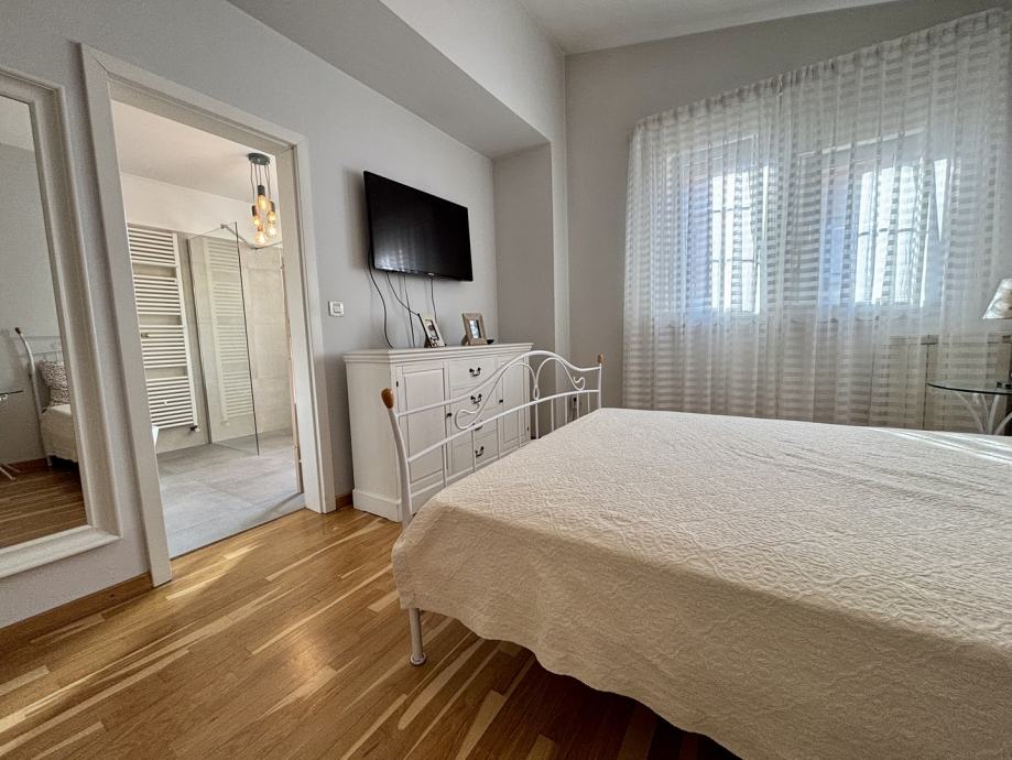 Ovaj četverosoban stan ističe se prostranošću i izuzetno povoljnim položajem na zadnjem katu, što pruža dodatnu privatnost i mir. Orijentacija stana na sve četiri strane svijeta – sjever, jug, istok i zapad – osigurava obilje prirodne svjetlosti tijekom cijelog dana te omogućava lijep pogled i vrlo sunčanu atmosferu. Stan se sastoji od tri spavaće sobe, prostranog dnevnog boravka, zasebne kuhinje i blagovaonice, velike terase, balkona, dvije kupaonice s WC-ima, predsoblja, tavana i podruma, kao dodatne prostorije koje nude praktičnost i fleksibilnost za različite potrebe skladištenja stvari.