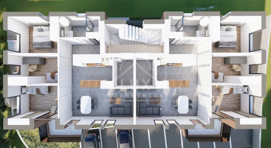 Stanu pripadaju i dva parkirna mjesta na okućnici zgrade (pov. 12.65 m2 i 12.65 m2), te spremište/drvarnica koja se nalazi na 2. katu zgrade (pov. 3.10 m2) i KROVNA TERASA (pov. 75.91 m2), te stubište koje vodi do krovne terase.