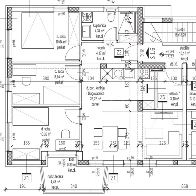 Stan S6 na 2. katu (zgrada A) S KROVNOM TERASOM, trosoban sadrži: hodniik, dnevni boravak s kuhinjom i blagovaonicom (pov. 25.17 m2), tri spavaće sobe (pov. 10.33 m2, 10.64 m2 i 8.74 m2), kupaonicu (pov. 4.34 m2) i natkriveni balkon (pov. 5.28 m2) s kojeg puca prekrasan pogled na grad, zadarski arhipelag i more. Stan s balkonom ima pov. 66.23 m2. Orijentacije je JUG-JUGOZAPAD.